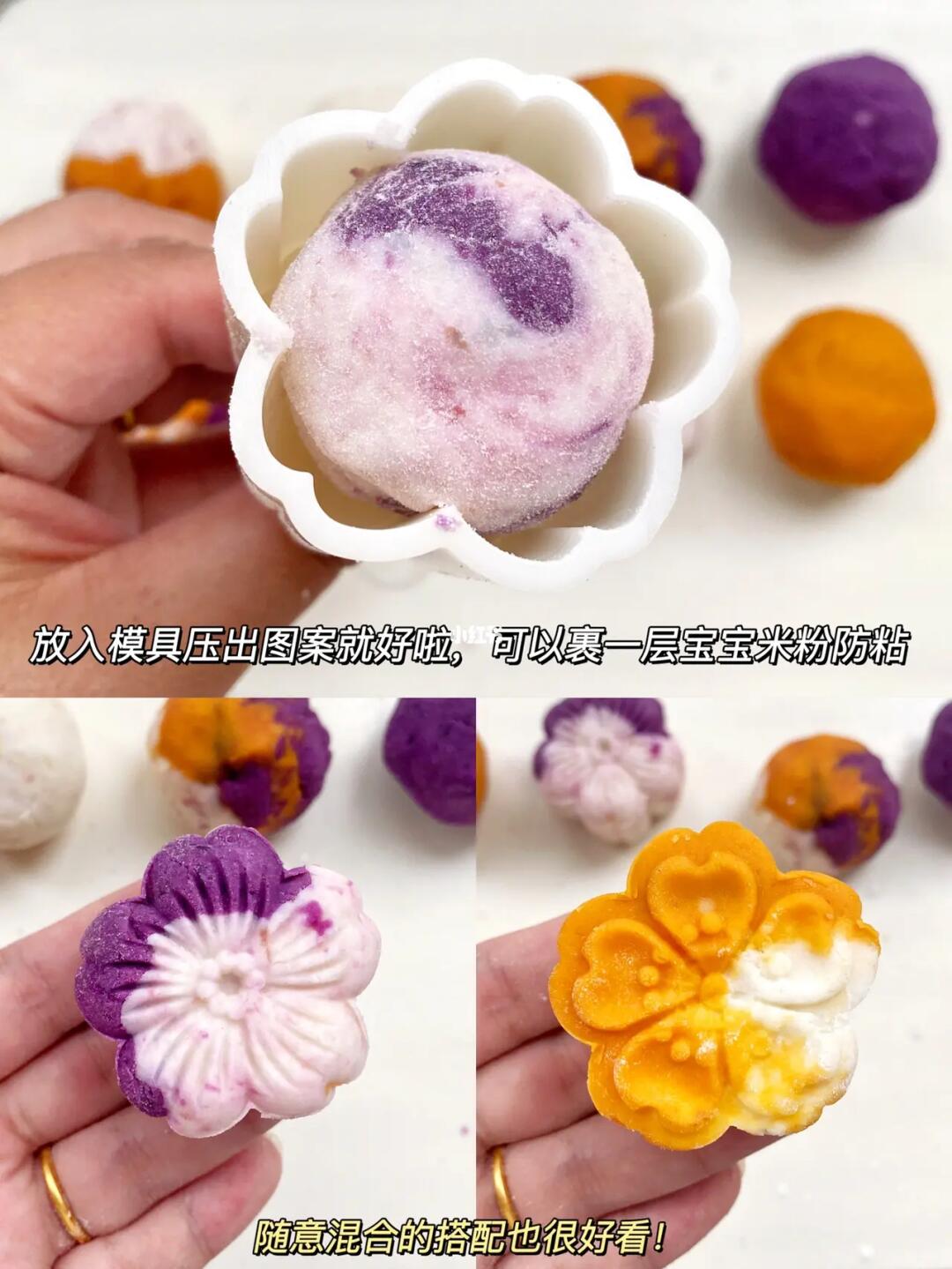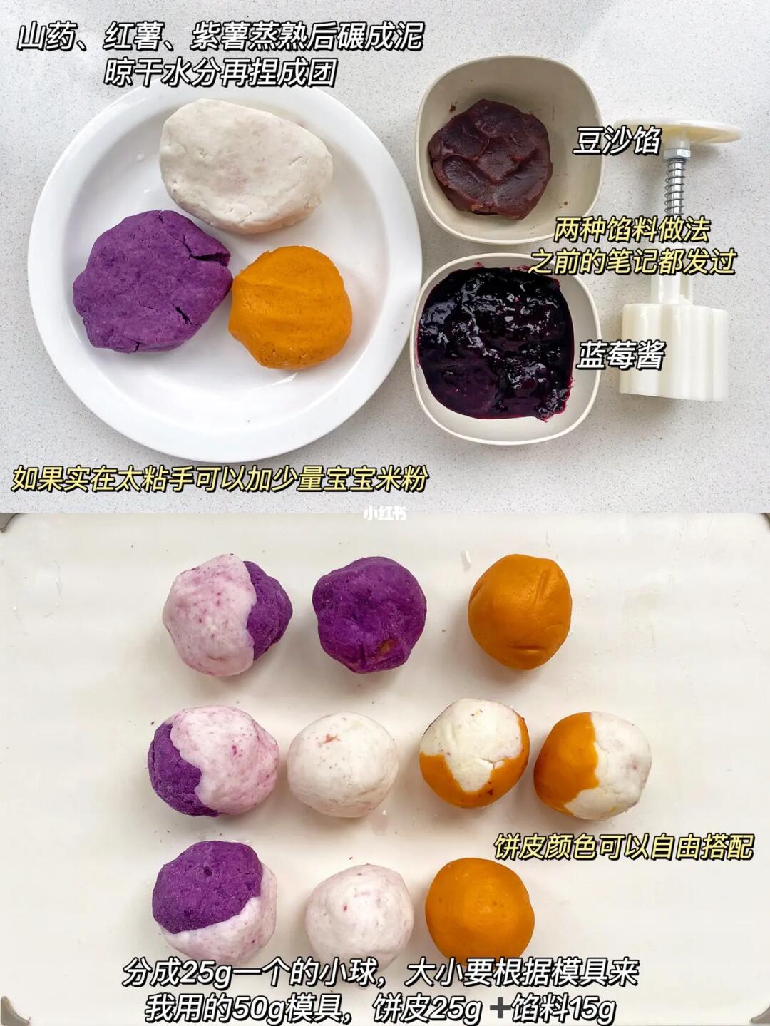 3⃣️将紫薯、山药、红薯泥分成 25g一个的小球,大小根据你的模具来。颜色也可以混合搭配。