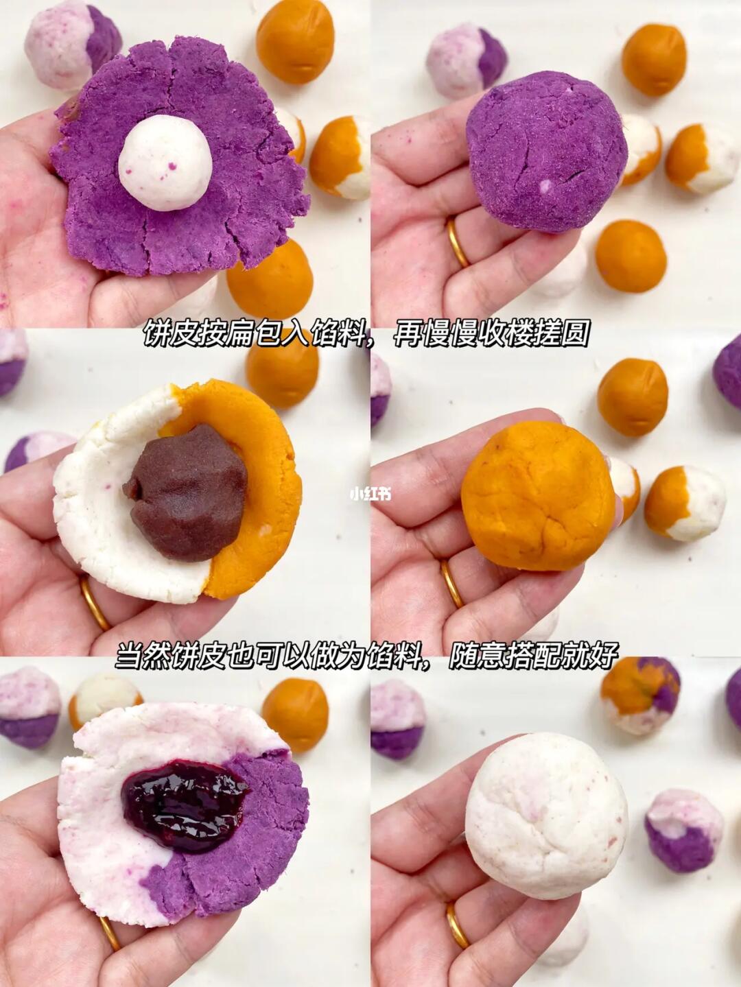4⃣️取一个球压扁放入紫薯泥、豆沙馅或者蓝莓酱(豆沙和蓝莓酱的做法之前都分享过)