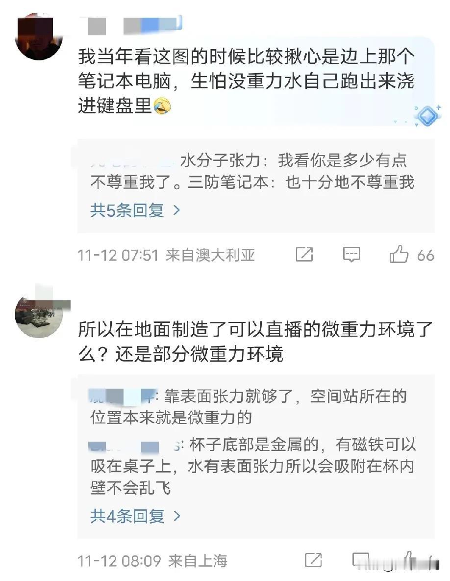 日本网友说这张太空站的合影是地球上拍摄伪造的,因为桌子上的水杯和水,日本网友说人类不可能以这种方式在太空喝水,然后有个润人呼应日本网友的质疑,阴阳怪气地说第一次看到太空中用水杯装水的,水还乖乖在下面! 一群初中物理都不及格的,居然在孜孜不倦地论证我们的载人航天和太空站是假的,其实得佩服这群物种,毅力真的很强,我们都实现载人航天已经22年了,它们还在论证我们是假的,其实网上都完全的事情,我们的航天员怎么把水挤进水杯,然后水在太空虽然没有重力,但水本身有张力,然后附着在水杯中,水杯底部是金属,桌子有磁性,所以就吸在桌子上了,只要上网搜太空站水杯,就有我们航天员操作的整个过程,但是它们用一张照片就在阴阳怪气,就在否认我们航天的真实性!