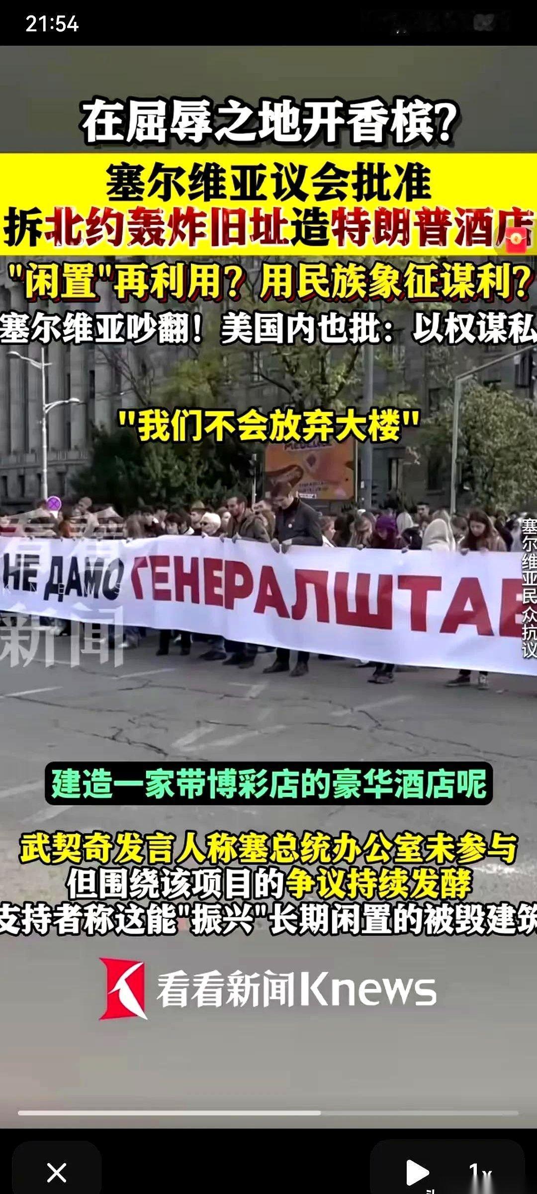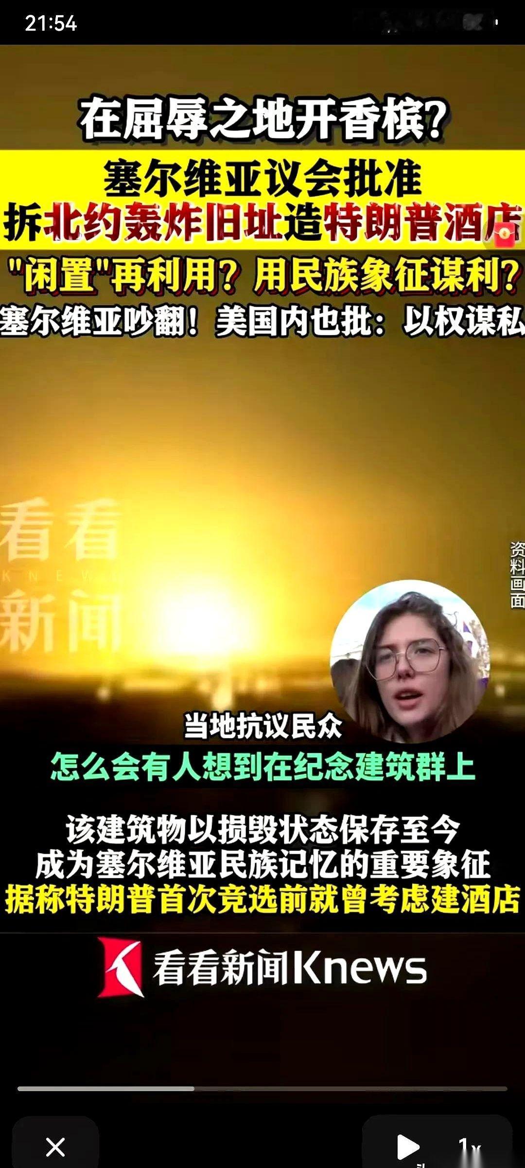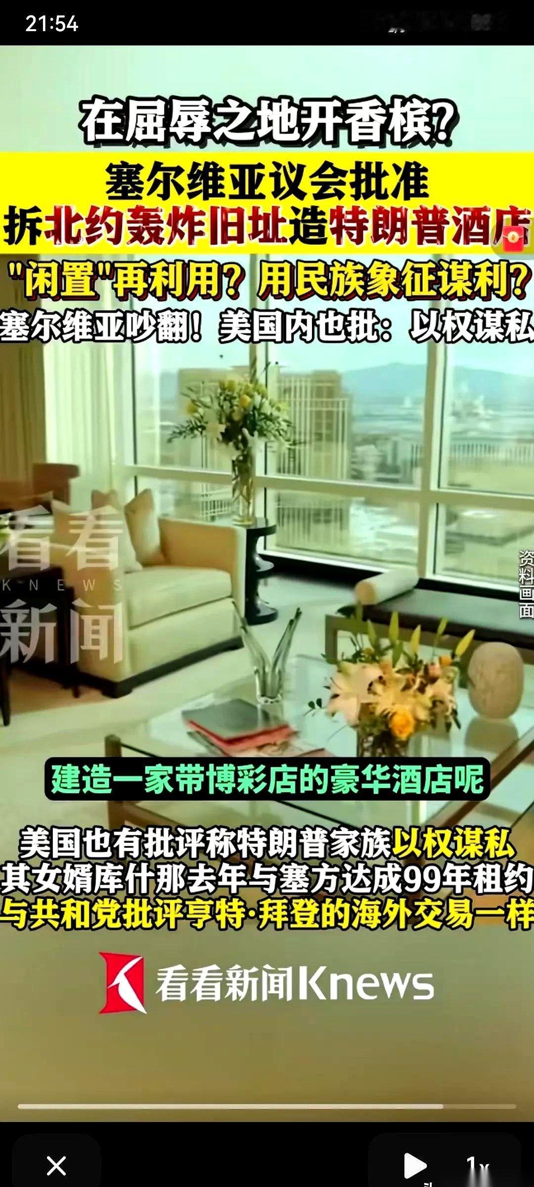 我跟你说个事儿,你听听有多离谱。 塞尔维亚,准备把当年被北约轰炸的遗址给拆了。那地方现在是个纪念馆,是人家民族伤痛的见证。 拆了干嘛? 给特朗普家族盖酒店。 你没听错,炸你家的人,现在要在你家伤疤上盖个销金窟,你还得点头哈腰说谢谢老板。 小国没得选,议会投票,谁敢说个不字?老百姓气得跳脚,有用吗?连美国人自己都看不下去,说这是以权谋私。 但这事儿,在他们那儿,可能还真就算“合法”。 就像有人说的,很多咱们觉得不可思议的贪腐,在他们那儿叫“合法游说”、“政治献金”、“旋转门”。总统帮亲戚朋友拉生意,帮华尔街大佬赚钱,甚至可以公开吹嘘。 中东的土豪们,直接把黄金地段免费送上门,求着你来盖楼。 这叫什么? 这就叫,把规则玩明白了。人家不是在规则里赚钱,人家是直接制定规则的人。 所以别再傻乎乎地问“他们怎么不管管”,人家自己就是裁判,怎么吹黑哨? 看到这些,我反而觉得咱们这边的老祖宗真有智慧。“公私分明”、“避嫌”、“瓜田李下”,这些词儿,不是迂腐,是刻在骨子里的政治伦理。 当官的,就不能想着发财。想发财,你就别当这个官。 道理就这么简单。 可惜,在有些地方,这最朴素的道理,已经成了最奢侈的笑话。