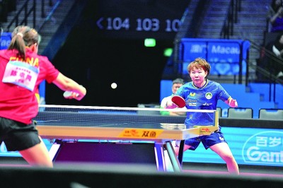 11月13日,澳门队的朱雨玲战胜辽宁队的陈幸同,晋级乒乓球女单四强。本报记者朱晓帆摄光明图片