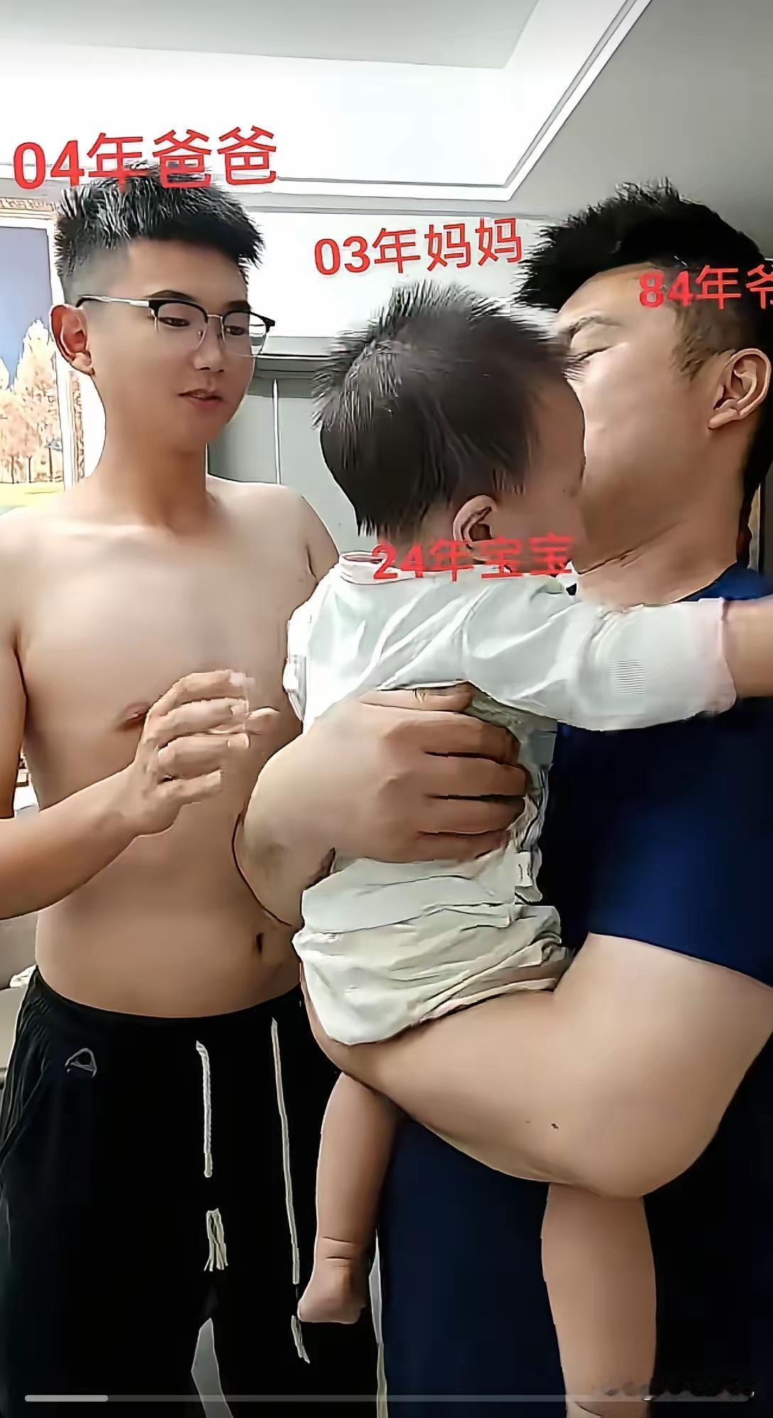 厉害的一家人? 84年的爷爷,04年的爸爸,24年的孙子,这节奏真够快,踩着点儿紧跟老爹爹的步伐,很遗憾没能实现了赶超,不过也够长江后浪推前浪,打了个平手,婆婆的大花臂挺漂亮,一大亮点! 这一家人在生育问题上三观一致,齐头并进,奋勇当先,紧抓年龄的关口,踩着相同的步伐,真可谓青出于蓝而胜于蓝,年轻的爷爷年轻的爸爸,年轻的奶奶看着可爱的孙子,弱弱的问一句:这位年轻的奶奶非同寻常,咋爱上了纹身呢?别有一番风情在心头吧?是个有故事的奶奶。 大家同意吗?