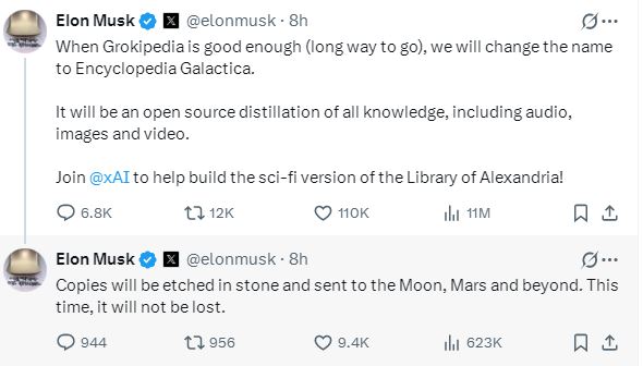 马斯克在社交平台X上发帖称:“当Grokipedia足够好时(还有很长的路要走),我们将把名字改为卡拉狄加百科全书(EncyclopediaGalactica)。它将是所有知识的开源精华,包括音频、图像和视频。加入xAI,来帮助建立科幻版的亚历山大图书馆!”马斯克在另一条帖子中补充称,这套百科全书的“副本将被蚀刻在石头上,并被送往月球、火星和更远的地方。这一次,它不会丢失。”