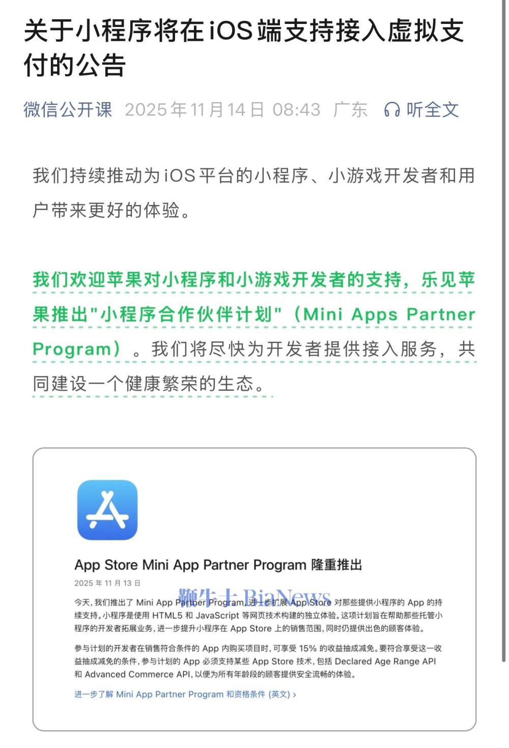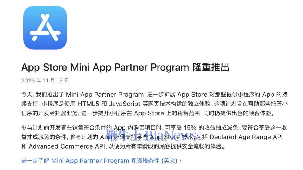 我们欢迎苹果对小程序和小游戏开发者的支持,乐见苹果推出"小程序合作伙伴计划"(MiniAppsPartnerProgram)。我们将尽快为开发者提供接入服务,共同建设一个健康繁荣的生态。