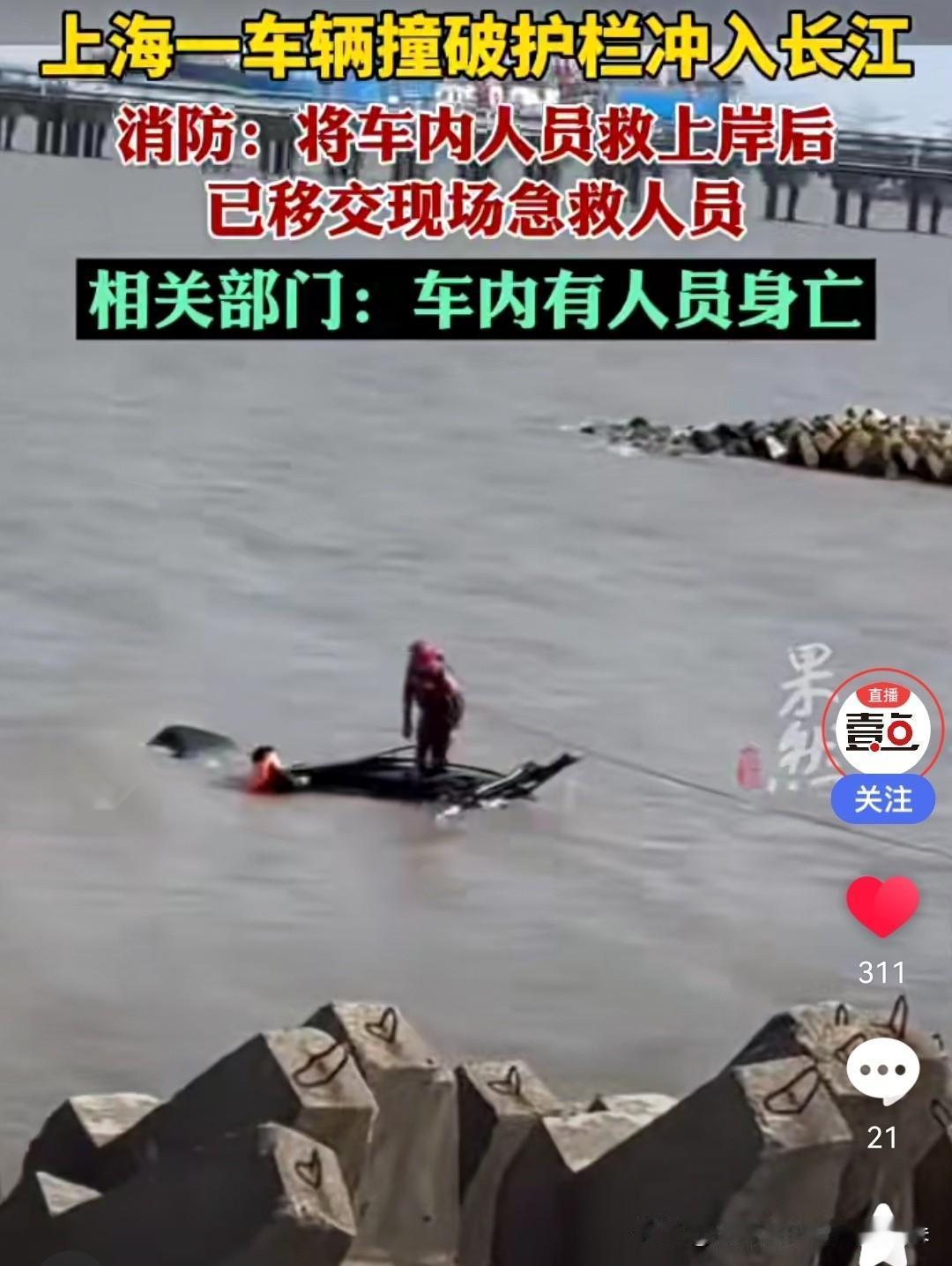 【突发】上海滨江森林公园附近一汽车高速冲破江堤护栏坠江!搜救结束,车内有人不幸身亡 2025年11月14日 上海 11月13日,上海浦东新区滨江森林公园附近发生一起严重车祸。一辆汽车在双江路路口突然高速行驶,冲上江堤并撞破护栏,随后坠入长江。事发后,当地公安、消防及长江航运公安迅速展开搜救,但遗憾的是,车内人员已确认不幸身亡。 现场直击:车辆高速冲破护栏坠江 据目击者描述,事发时车辆行驶速度极快,在双江路路口突然失控,直接冲上江堤,随后撞破护栏坠入江中。现场护栏被撞毁,车辆坠江后部分车身一度淹没在水中。 接警后,长江航运公安、消防救援、120急救等部门立即赶赴现场,联合展开搜救行动。由于江水较急,救援难度较大,但救援人员仍全力搜寻车内人员。 搜救结束,确认伤亡 经过紧张搜救,车辆最终被打捞上岸,车内人员已无生命体征。目前,事故具体原因仍在调查中,警方尚未公布涉事司机身份及车辆信息。 网友关注:滨江森林公园路段为何频发事故? 该路段靠近滨江森林公园,是市民休闲游玩的热门地点,但部分道路临江且弯道较多,此前也曾发生过类似险情。此次事故再次引发网友对道路安全防护措施的讨论,不少市民呼吁加强临江路段的护栏加固和交通管理。 🔍 目前进展: - 事故原因:警方正在进一步调查中(是否涉及酒驾、超速或其他因素)。 - 道路情况:事发路段暂时未封闭,但交警加强巡逻。 💬 网友评论: “太可怕了,滨江这边车流量不小,希望加强防护!” “每次路过临江路段都提心吊胆,护栏真的能拦住高速车辆吗?” 我们将持续关注事件最新进展,如有更多消息,将第一时间更新。 (本文综合自警方通报及现场目击者信息,具体细节以官方发布为准) 上海交通事故 滨江森林公园 车辆坠江