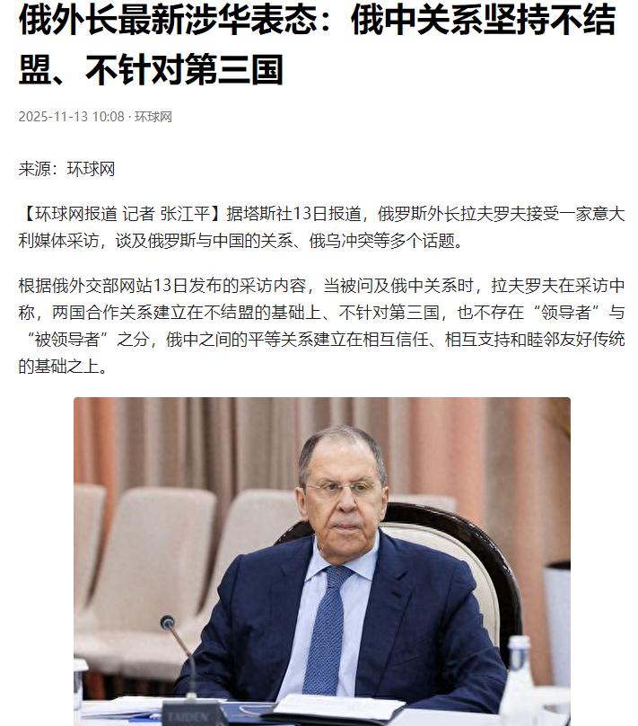 俄罗斯突然宣布了 11月13日消息,俄罗斯外长拉夫罗夫在接受意大利媒体采访时表态:中俄关系是“结伴不结盟”,不存在谁领导谁的问题。 这话一出来,好多人都愣了下,中俄关系不是好得常被外界凑一对吗?咋突然说“不结盟”?可仔细一想就明白了,这哪儿是意外,分明是大国相处的顶聪明办法。 回头想想当年中苏那事儿,教训太疼了。以前两国喊着“同志加兄弟”,还签了同盟条约,结果到后来,边境上两边都堆了上百万兵,互相防着,连好好打交道都难。问题就出在“结盟”上,一旦绑在一起,就得被迫选边站,一方的外交得迁就另一方,自家的利益反倒要往后靠。比如当年苏联搞霸权扩张,逼着中国跟它保持一致,这种绑死的关系,早晚得散。 现在中俄说的“结伴”,那是真能拿到好处的合作。中国都15年是俄罗斯最大的生意伙伴了,俄罗斯的石油天然气不停往中国运,咱们的汽车、家电也摆满了俄罗斯的商店;两军会一起搞演习、海上巡逻,但从来明说“不针对别人”;国际上美国搞单边制裁、乱管别人的事,两国还能一起站出来反对,守住国际法的底线。 但关键是“不结盟”这三个字,没了同盟条约的绑缚,中俄谁也不用听谁的。俄罗斯处理自己的安全事儿,中国不掺和;中国管亚太的事儿,俄罗斯也不指手画脚。 就像俄罗斯铁定会支持一个中国,反对“台独”,中国也支持俄罗斯维护自己的主权领土完整,这是互相帮衬,不是被逼着站队。拉夫罗夫特意说“谁也领导谁”,就是把话说透了:没有谁是老大,就是最铁的合作伙伴。 这种关系有多经得住折腾?看这些年的国际风浪就知道。不管西方怎么炒“中俄威胁论”,怎么搞制裁施压,两国该合作还合作,该支持还支持。2021年两国外长签联合声明,说要维护联合国牵头的国际体系;2024年建交75周年,又重申这种“不结盟、不对抗、不针对第三方”的路子,这显然不是临时想法,是长期打算。 再看看现在的国际上,美国还拉着北约搞小团体,逼盟友选边站,结果内部矛盾一大堆。中俄刚好反过来,不搞排外的小圈子,不拿意识形态捆着彼此,就认平等互利。就像《中俄睦邻友好合作条约》里写的,这是超越冷战军事同盟的新关系,既能让两国拿到实在好处,又能在乱哄哄的世界里站稳脚,真是大国相处的好样子。 所以拉夫罗夫这话,其实是把中俄关系的老底亮给世界看,我们关系好是真的好,但不搞拉帮结派;互相帮衬,但各自的外交主意自己拿。这种像成年人一样的相处方式,比绑在一起的同盟结实多了。