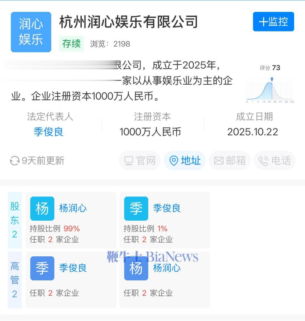 天眼查信息显示,10月21日和10月22日这两天,分别成立了杭州润星娱乐有限公司、杭州润心娱乐有限公司,注册资本皆为1000万元。