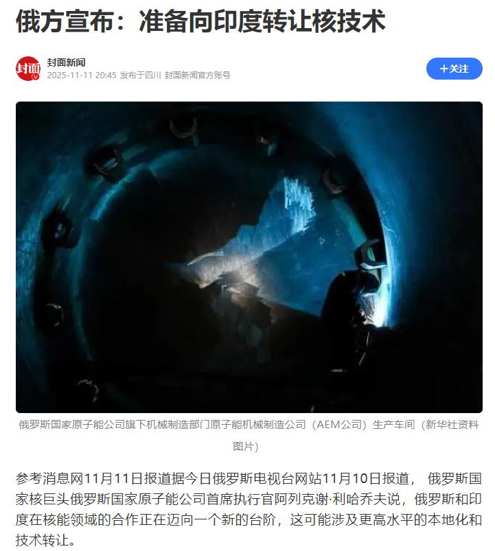 历史性突破,普京下血本了!11月10日俄媒爆出猛料,俄罗斯绕过中美向印度转让核技术,并且这次俄核电巨头同意给的还是“独家机密”——漂浮核电站,知情人士透露:俄印在核能领域的合作迈向了新一个台阶,并且设计更高水平的本土化和技术转让! 估计有人要挠头了,这漂浮核电站到底是啥好东西?其实特简单,就是把一整套核电站“打包”装在一艘大驳船上,能像轮船似的在海上漂,哪儿缺能源就拖到哪儿去。 俄罗斯那艘“罗蒙诺索夫院士”号就是现成的样板,长140米、宽30米,排水量比两万顿级的军舰还大,船上两座核反应堆能输出70兆瓦电力,够20万人的城市用不说,每天还能淡化24万立方米海水,不管是偏远海岛还是海上油田,能源难题都能靠它解决。 这技术可不是随便就能给人的,俄罗斯自己2019年才让“罗蒙诺索夫院士”号正式投入使用,到现在都是全球独一份的成熟技术。以前西方媒体追着问,俄罗斯官方都嘴严得很,如今却对印度敞开门,连“独家机密”都肯松口,核心就是要搞技术转让,不只是卖现成的设备,连反应堆设计、船体怎么集成、核废料怎么处理这些关键活儿,都要教给印度本土企业。 俄印这波操作,说白了就是各取所需、互相搭台。对俄罗斯来说,出口核能技术就是实打实的“摇钱树”,印度又是全球出了名的缺能源大国,光民用核电项目就欠着俄罗斯一屁股订单。这次抛出漂浮核电站这个“硬通货”,既能赚技术转让费,又能把印度绑在自己的核能产业链上,毕竟往后的燃料供应、设备维护升级,印度都得找俄方。 印度更是急着抱这根“救命稻草”。这些年印度经济跑得挺快,但能源短板越来越明显,特别是沿海的油气开发和偏远地区供电,拉电网成本高还费时间。漂浮核电站刚好戳中这个痛点,拖到孟加拉湾就能给海上油田供电,开到阿拉伯海沿岸就能解决缺水问题。 更关键的是,印度一直想搞“核自主”,以前自己造核电站动不动就延期十几年,现在有俄罗斯手把手教,等于直接走了条近路。 至于说“绕过中美”,其实没那么玄乎。俄罗斯跟中国在核能领域本来就合作得深,咱们的田湾核电站、徐大堡核电站都用的俄罗斯技术,双方合作方向不一样,根本不存在什么“选边站”;而美国跟印度搞核合作时总打自己的小算盘,之前卖核电技术还附加一堆条件,俄罗斯这次不搞政治捆绑,自然更对印度的胃口。 不过这事儿也不是没人反对,环保组织早炸开锅了。绿色和平组织直接警告,海上核电站万一被撞或者遇上台风,核泄漏的风险比陆地核电站高多了,要是反应堆过热熔化,放射性物质流进大海,危害可能比切尔诺贝利还严重。 对此俄罗斯倒挺有底气,说这种反应堆用了最新的安全技术,连强烈地震都扛得住,之前“库尔斯克”号核潜艇沉了,核反应堆都没受损,这就是活生生的例子。 说句实在话,俄印这步棋走得挺精明,但印度能不能接得住还是个未知数。漂浮核电站看着好用,可核安全管理、操作人员培训都是高技术活儿,印度以前连常规核电站都老出小故障,现在直接上手“移动版”,难度可想而知。 而且本土化生产可不是拧螺丝那么简单,像无缝钢管、核燃料处理这些核心部件,印度的产业链能不能跟上,真不好说。 说到底,这笔合作既是俄罗斯盘活核能产业的好办法,也是印度补能源短板的尝试,本质上就是国与国之间的利益互补。那些所谓的“地缘博弈”,倒不如说是市场需求催出来的结果,毕竟在能源面前,技术和利益比空喊立场实在多了。就是希望印度能把安全放在第一位,别让这“海上核电厂”最后变成“海上定时炸弹”。