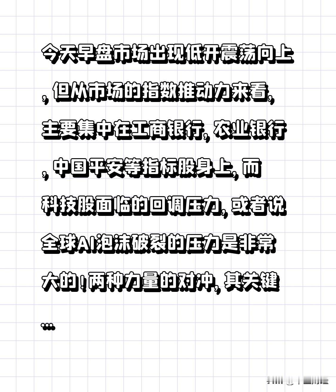【A股今天】今天早盘市场出现低开震荡向上,但从市场的指数推动力来看,主要集中在工商银行,农业银行,中国平安等指标股身上,而科技股面临的回调压力,或者说全球AI泡沫破裂的压力是非常大的! 两种力量的对冲,其关键是大盘银行,保险等指标股能否顶住?如果顶不住大盘指数将出现快速下跌,相反,如果顶得住,市场有望小阴小阳! 从世界经济以及军事演变来看,A股所面临的内外部环境还是不确定性风险较高的,此时,股票的投资需要谨慎再谨慎,短线波动,投资者只需适量资金参与即可,稳健的投资者建议继续观望!A股指数 大盘分析行情 大盘走势 科技股市场情绪 银行大盘股 银行行情 A股股指 农业银行市值