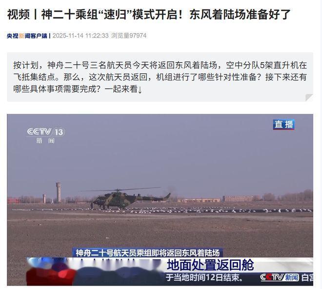 报道透露,神舟二十号航天员乘组乘坐神舟二十一号载人飞船返回东风着陆场,采用3圈快速返回方案,较以往5圈快速返回快约3个多小时,预计今天下午抵达东风着陆场西区。