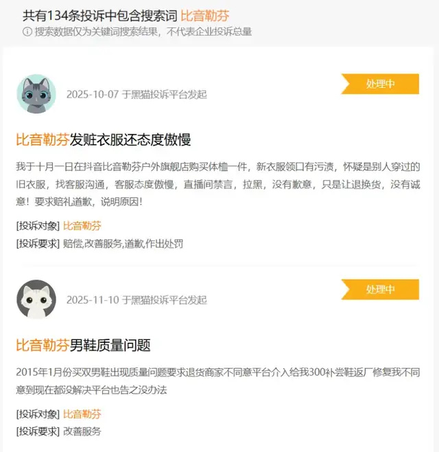 (比音勒芬的投诉情况,图源:黑猫投诉平台)