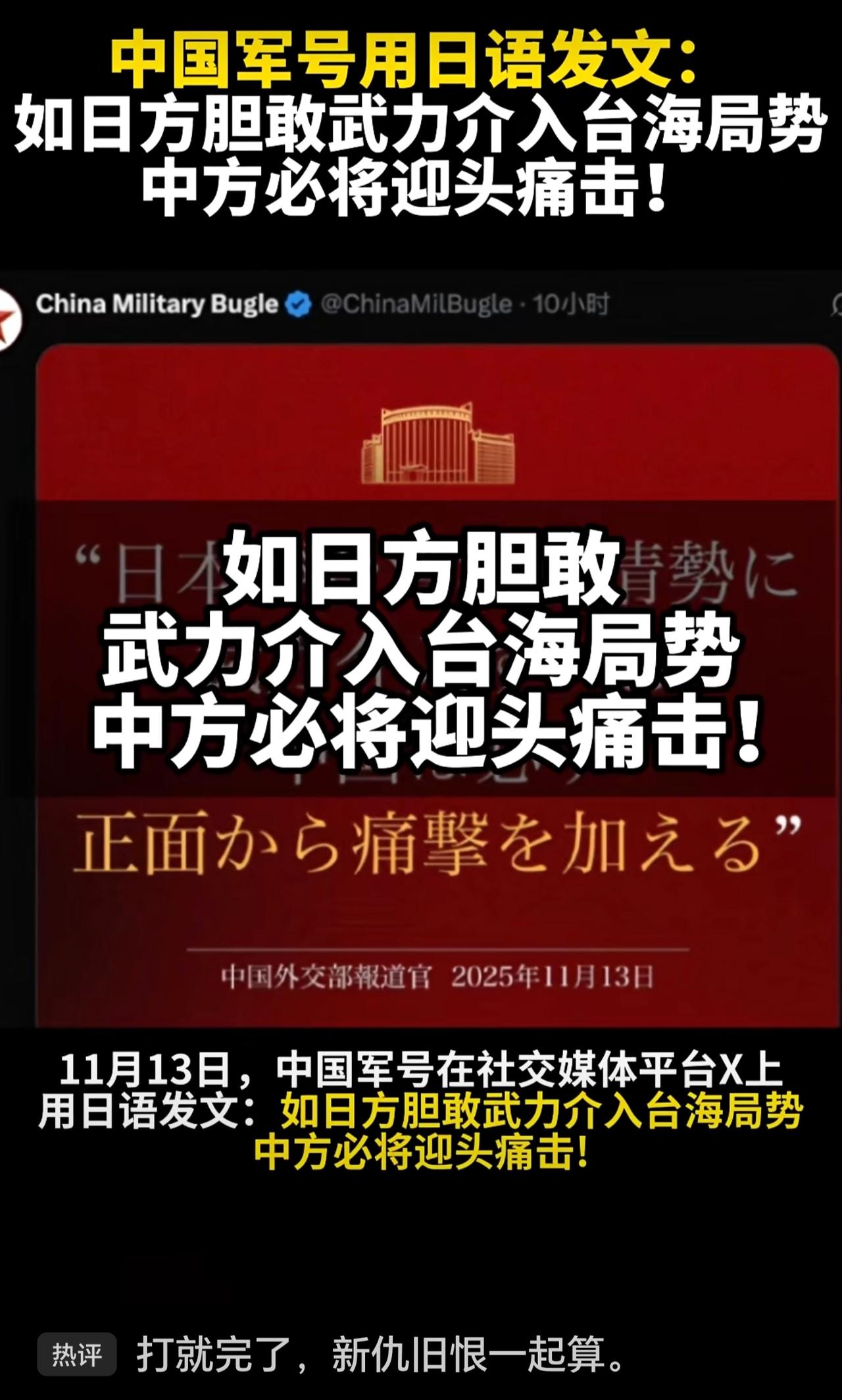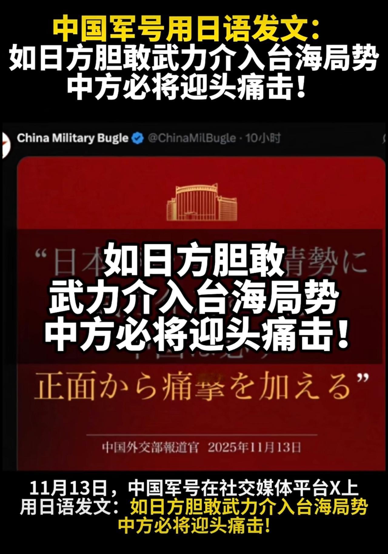 中国军号用日语发文:如日方胆敢武力介入台海局势,中方必将迎头痛击!