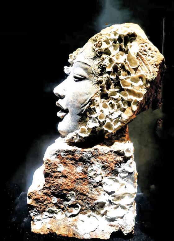 “这是我的第一件贝石作品,极具巧思。”在而华居,记者看到了《人生如戏——青衣·海韵》,那是一块半面平滑,半面全是贝壳的贝石。郑而华没有改变石头本身的轮廓,而是顺势而为:在石面平坦处,精雕出一位戏曲花旦清秀的侧面容颜,她眉眼低垂,唇角含着一丝若有若无的微笑,韵味悠长。而那另一半天然隆起、密布着牡蛎壳的部分则被完整保留,它们恰如花旦头上层层叠叠、珠翠点缀的发饰,浑然天成。