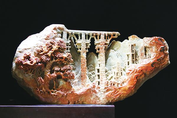 郑而华从事寿山石雕刻艺术创作二十余年,在而华居里,一件名为《饮水思源》的石雕作品引人关注。石料本身粗犷,却被巧妙化为平潭旧时水渠历经风霜的古朴肌理,那红白相间的部分如神来之笔,蜿蜒成水渠的渠身,像是一条被时光浸染出的血脉。