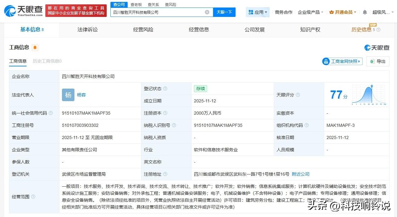 【川大智胜等成立智胜天开科技公司 注册资本2000万】 天眼查App显示,近日,四川智胜天开科技有限公司成立,法定代表人为杨容,注册资本2000万人民币,经营范围包括软件开发、软件销售、信息系统集成服务、计算机软硬件及辅助设备批发等。股东信息显示,该公司由四川川大智胜软件股份有限公司、成都信达联创贸易有限公司共同持股。 天眼查信息: