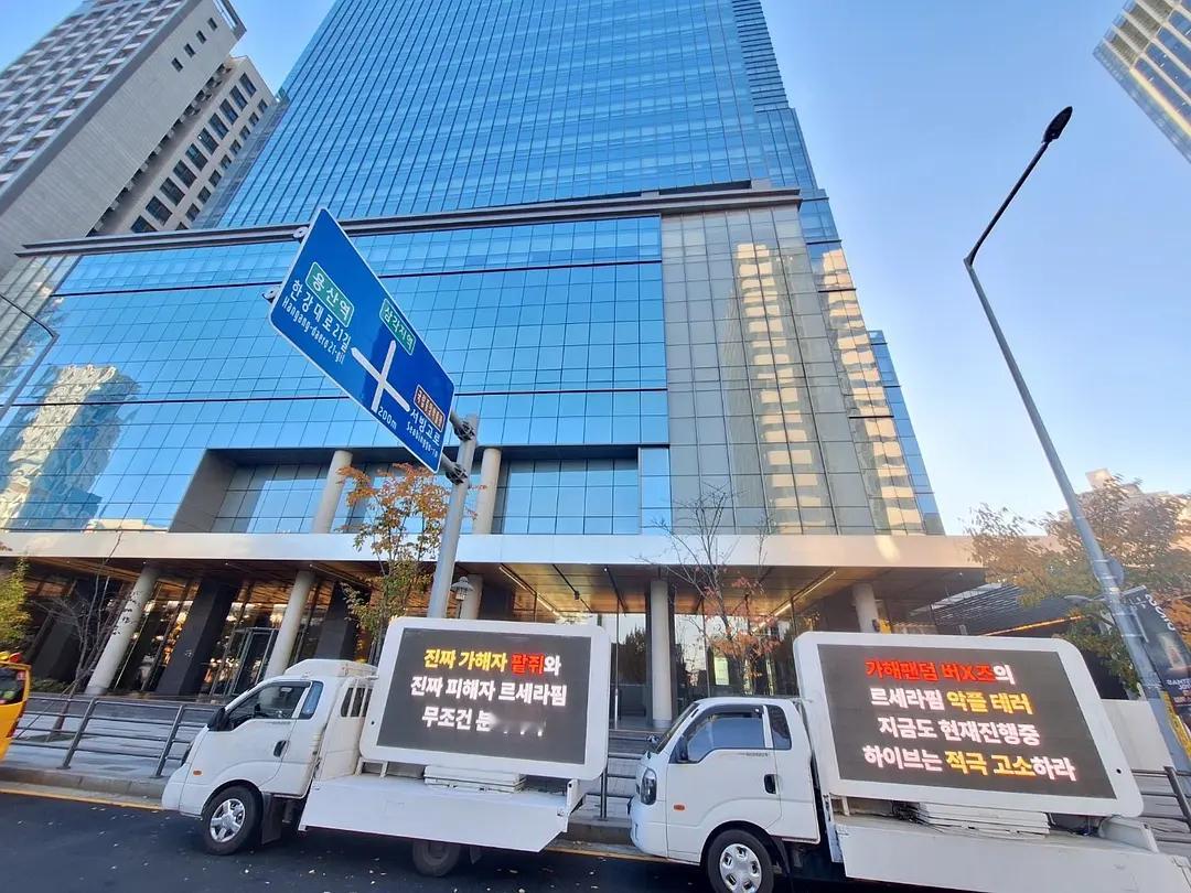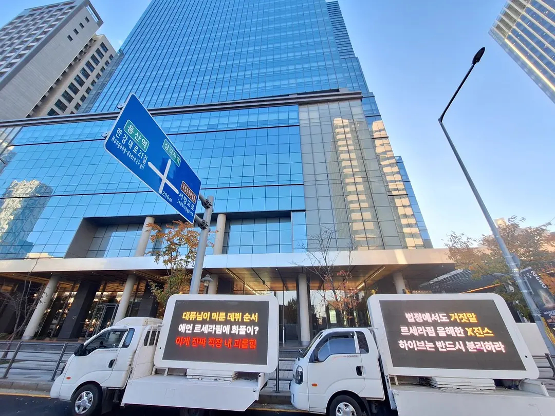 在得知 NewJeans全员即将回归ADOR后 LESSERAFIM 粉丝的维权卡车已经开到 HYBE楼下了