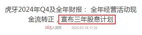 2024年年报中,虎牙宣布了三年股息计划,预期总派息金额不少于4亿美元。其中,2025年已支付3.4亿美元(约24.5亿元人民币)。