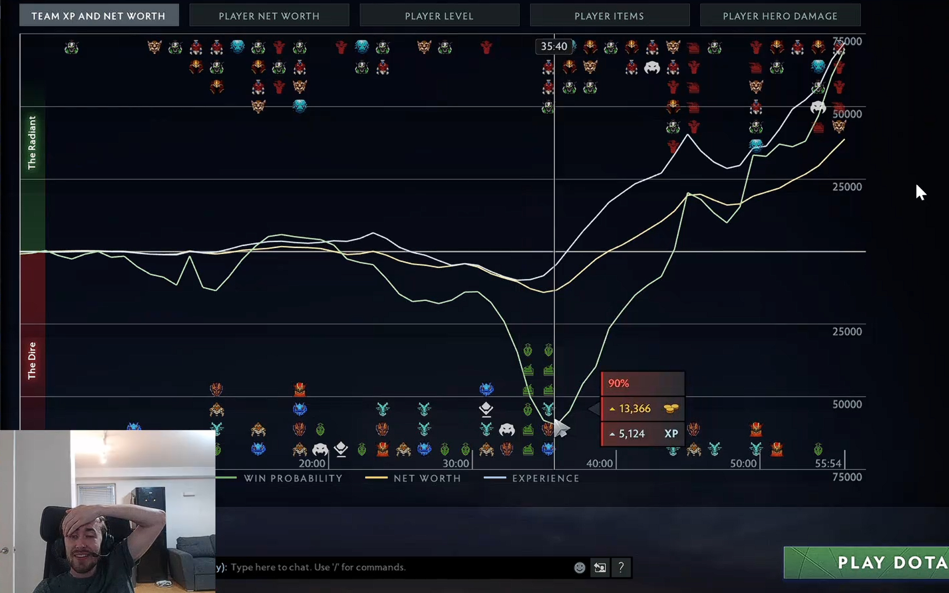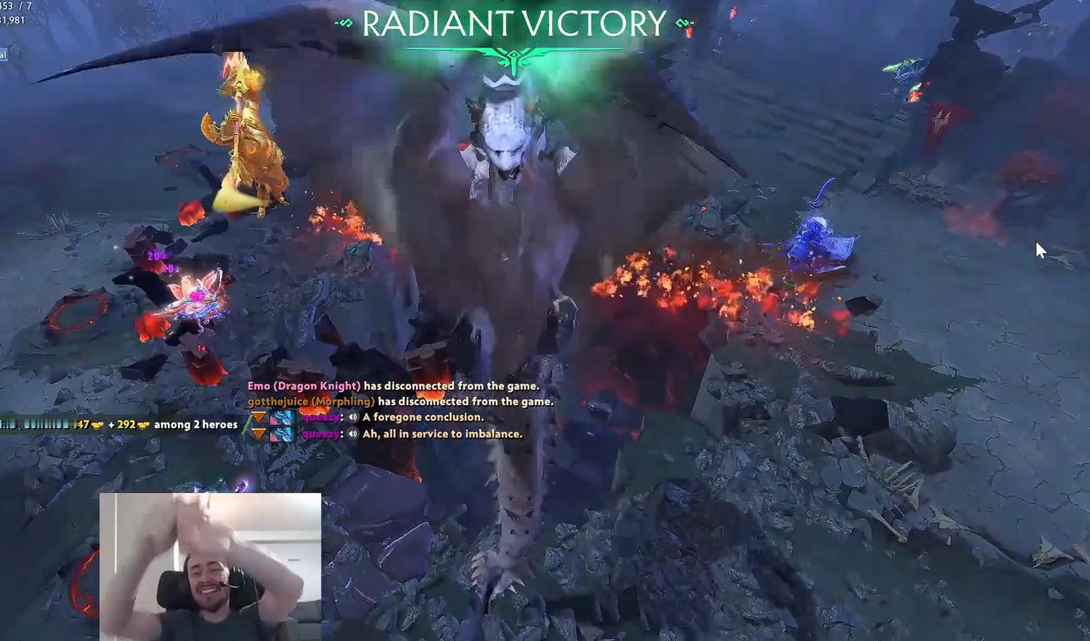 昨晚CCNC直播选到Ame(敌法)+xNova(小娜迦)打对面Emo + 其他国外职业选手,CCNC所在的天辉方早早被拆出超级兵,当时PLUS胜率一度给到了对面90%,但最终天辉众人齐心协力完成翻盘,赛后CCNC笑嘻了,一直在说"这局太疯狂了,这局太梦幻了,没想到这都能翻,太疯狂了"
