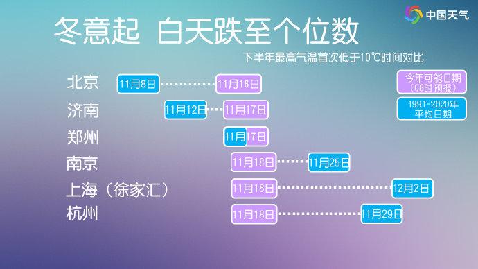 按目前的天气预报,18日杭州的最高气温将低于10℃,相比常年,江浙沪也是冷得有点早。