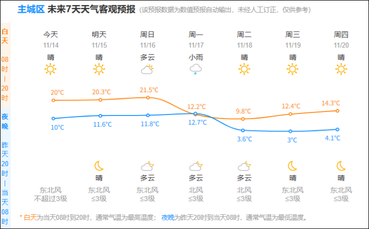 气温预报:17—18日受寒潮影响,气温快速下降,日平均气温过程降温幅度8~11℃,18—20日早晨最低气温平原地区1~4℃,有霜冻,山区0~-2℃,有薄冰,高山区-3~-5℃有冰冻。20日起气温有所回升。