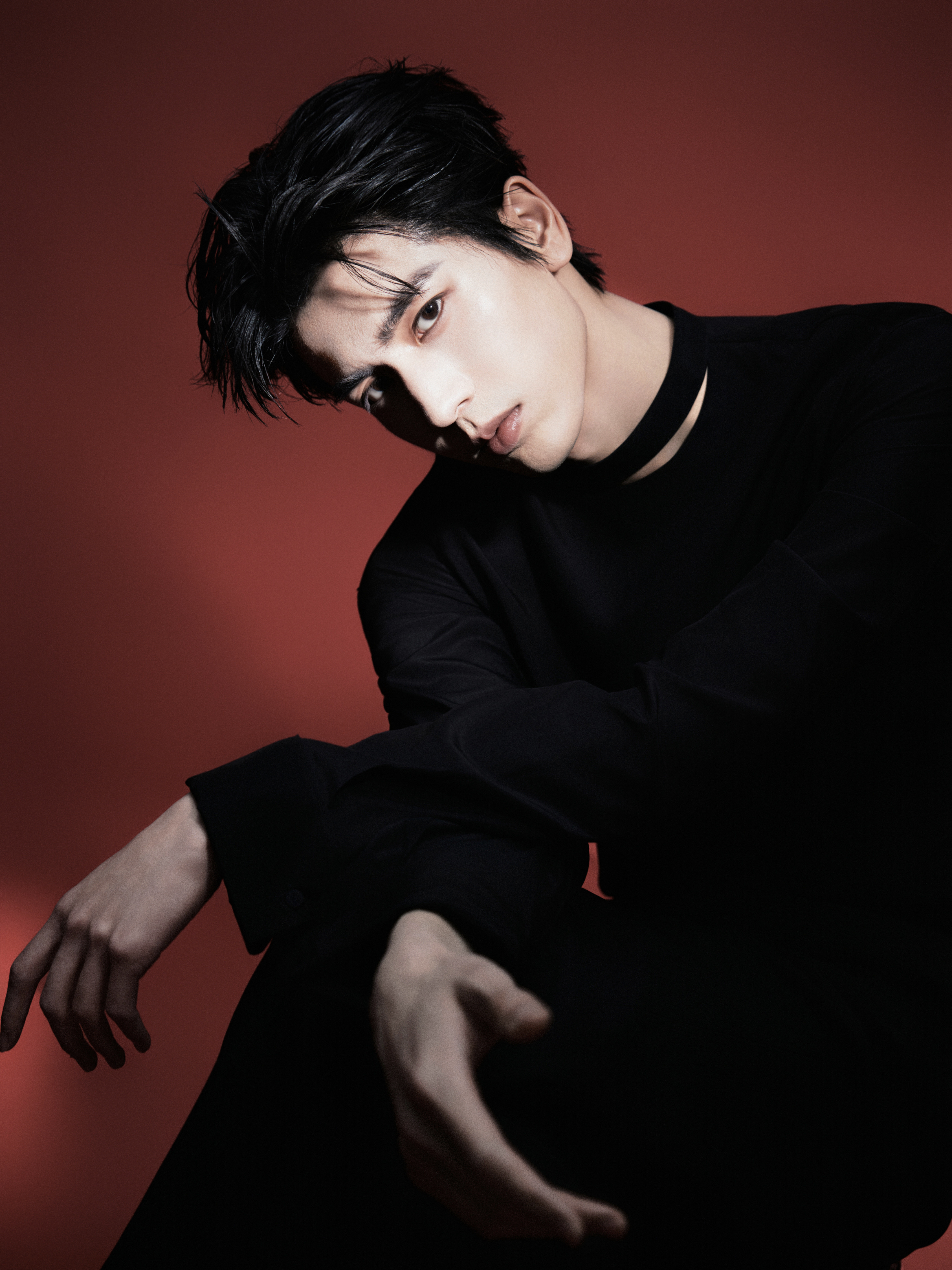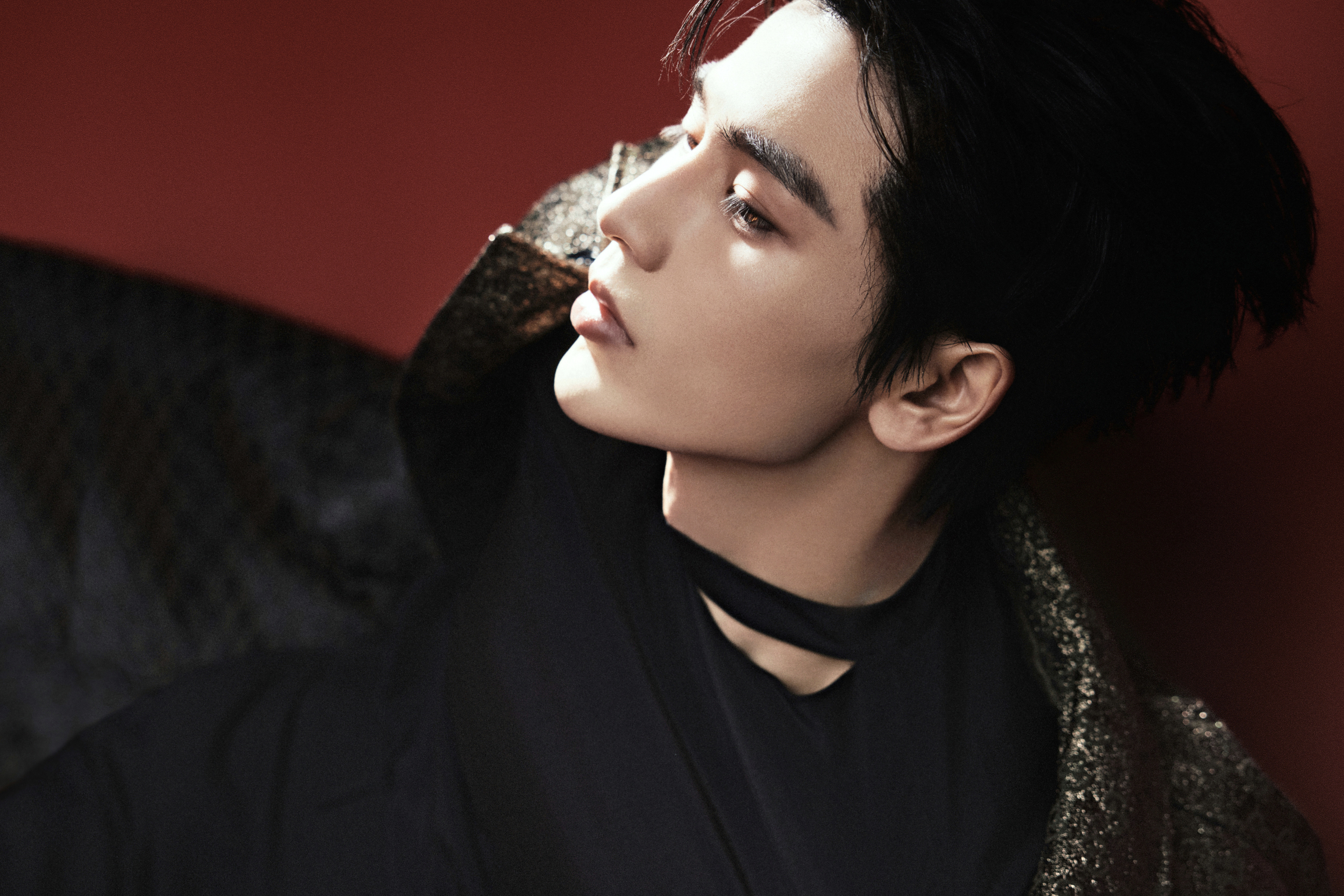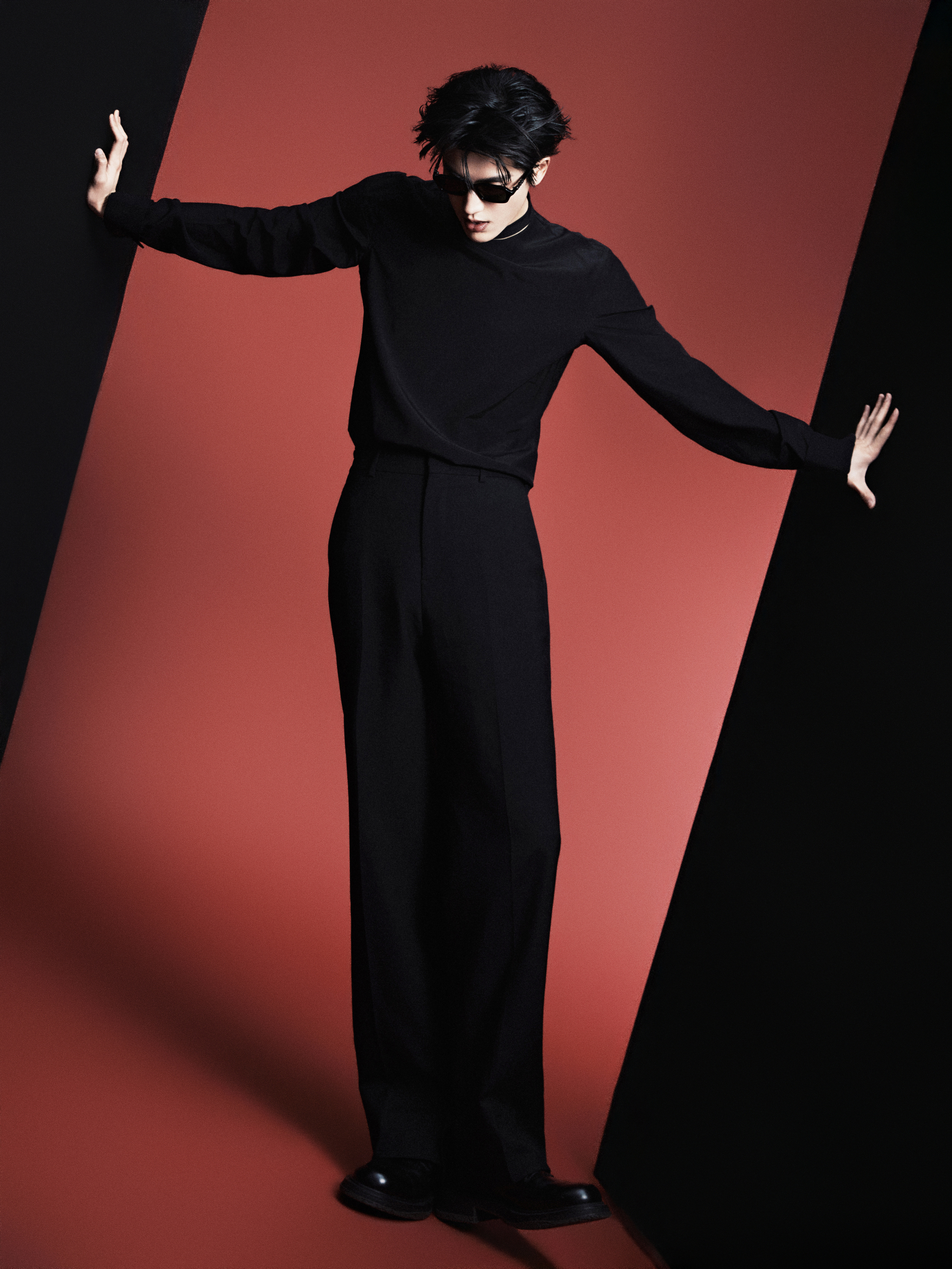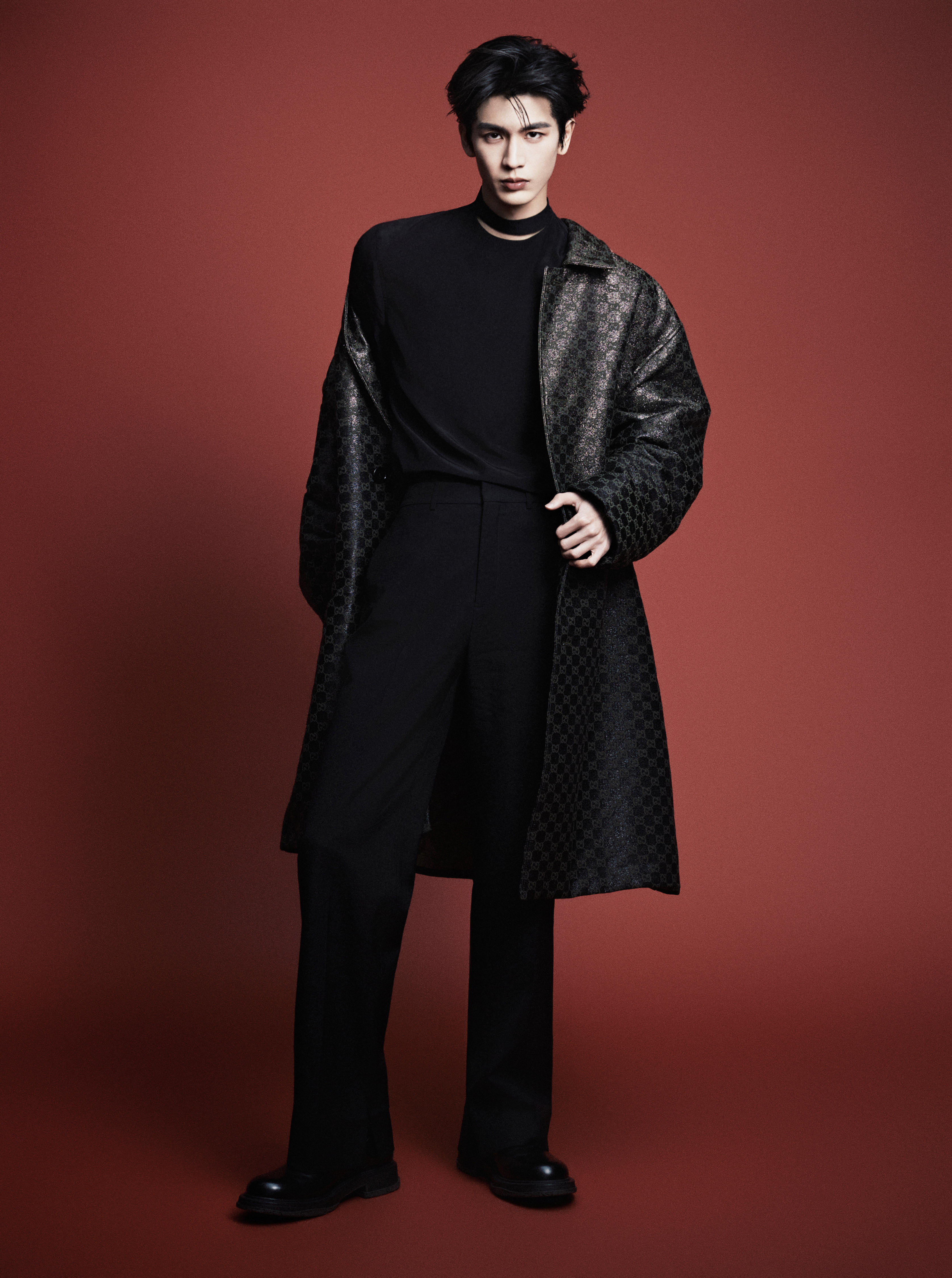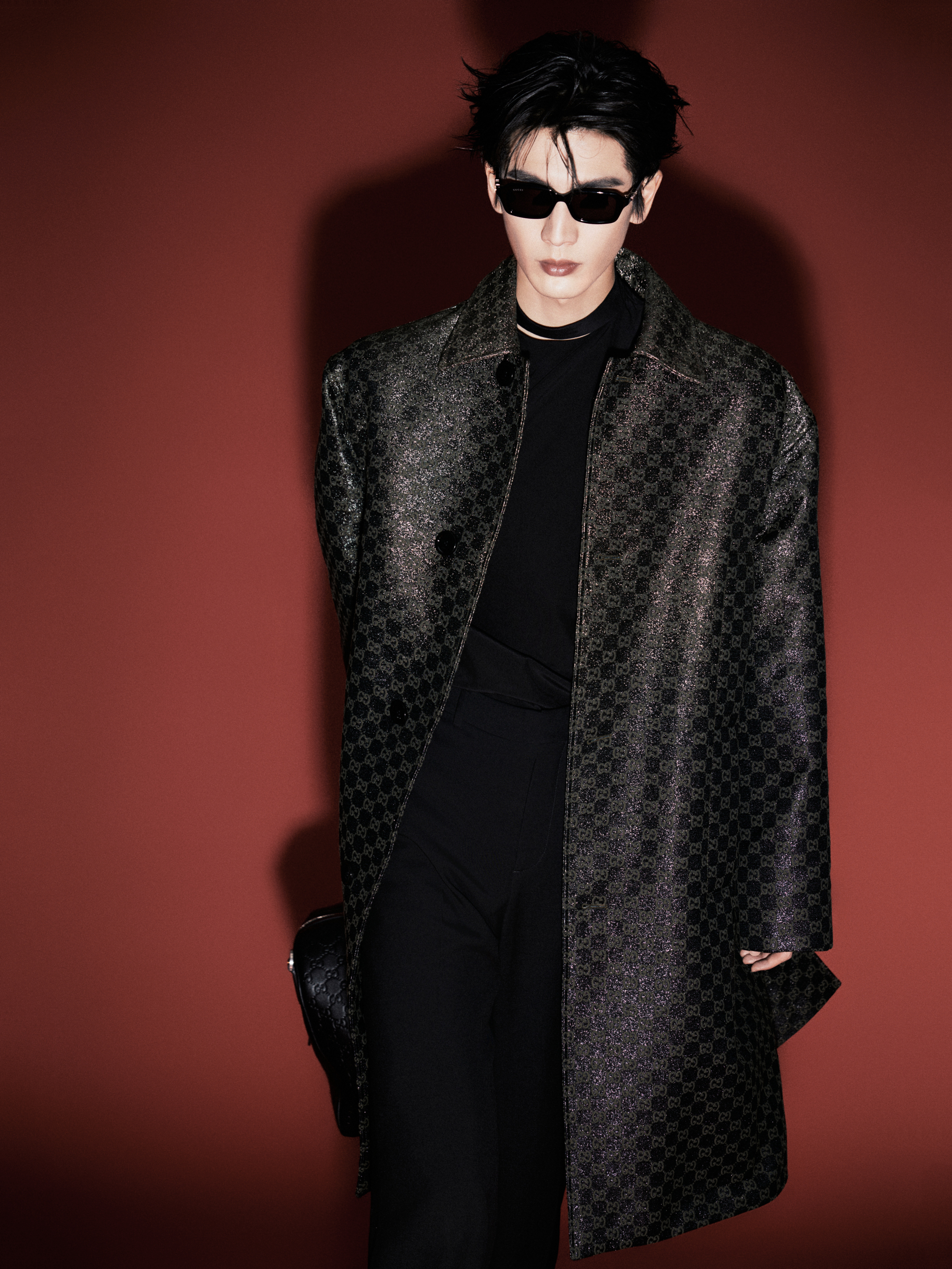 张凌赫 × GUCCI活动造型大片,in 双 G logo 皮革大衣,深红优雅格