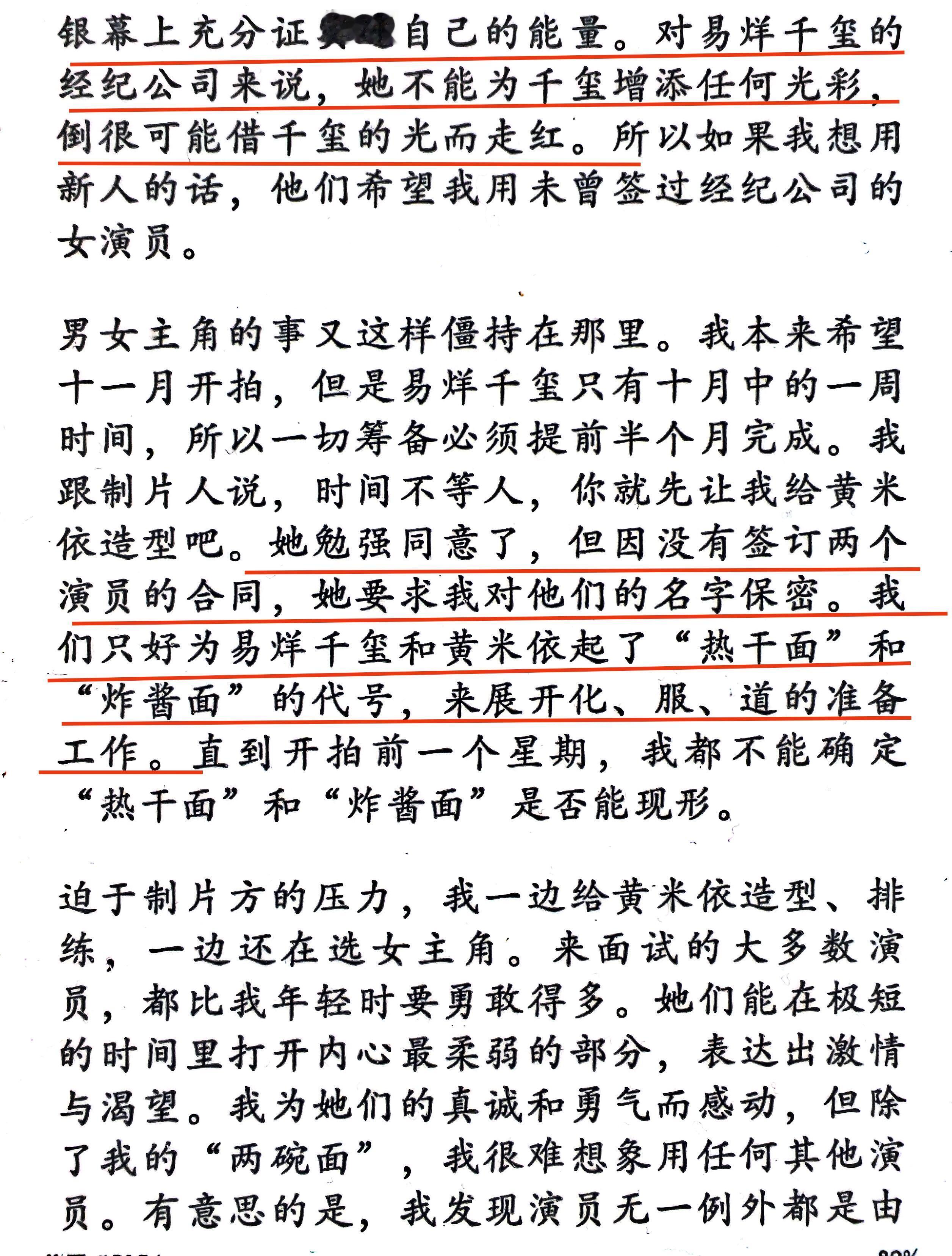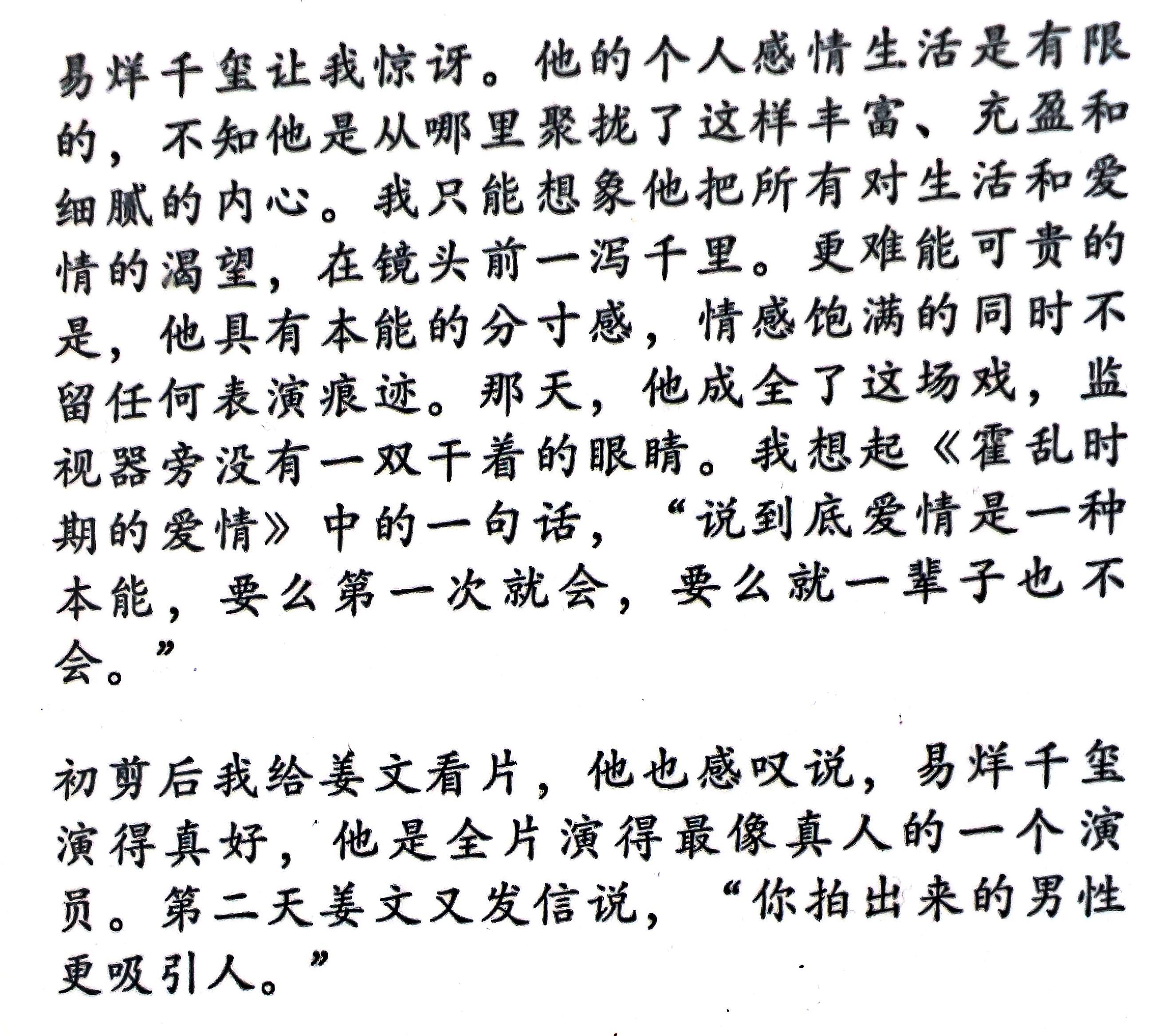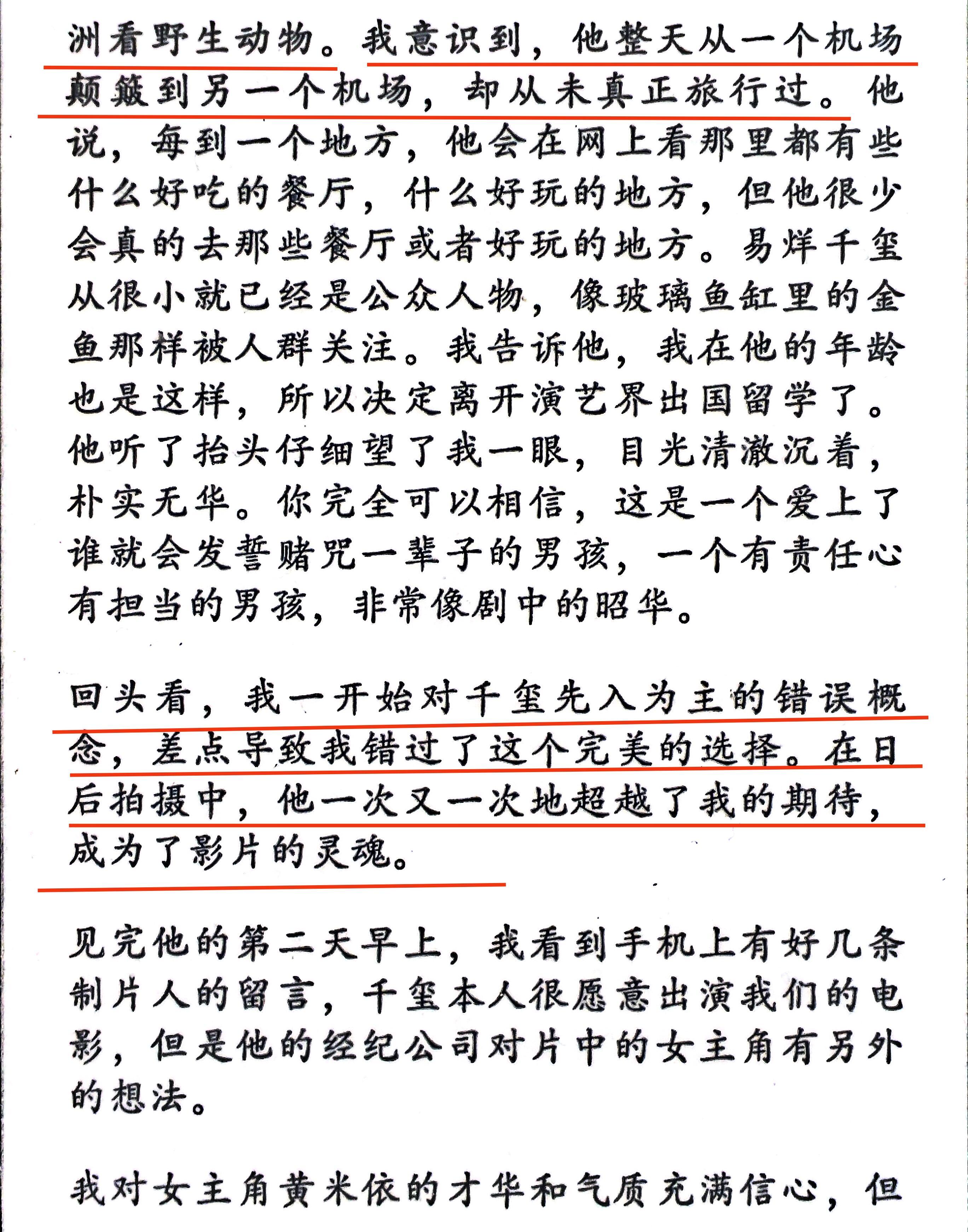陈冲猫鱼中讲述了邀请易烊千玺出演短片的趣事和评价“我一开始对千玺先入为主的错误概念,差点导致我错过了这个完美的选择。在日后拍摄中,他一次又一次地超越了我的期待,成为了影片的灵魂初剪后我给姜文看片,他也感叹说,易烊千玺演得真好,他是全片演得最像真人的一个演员。