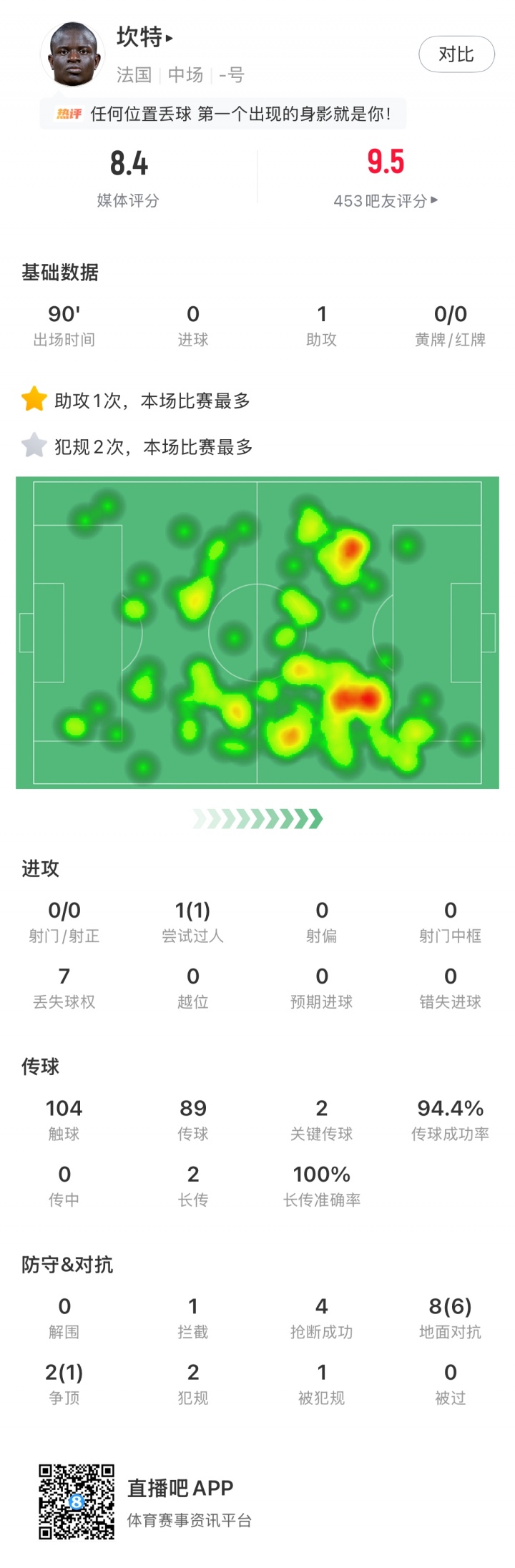 本场比赛,坎特送出1记助攻,1次过人成功,104次触球,仅7次丢失球权,传球成功率近95%,防守方面还有6次对抗成功、1次争顶成功、1次拦截以及4次抢断。