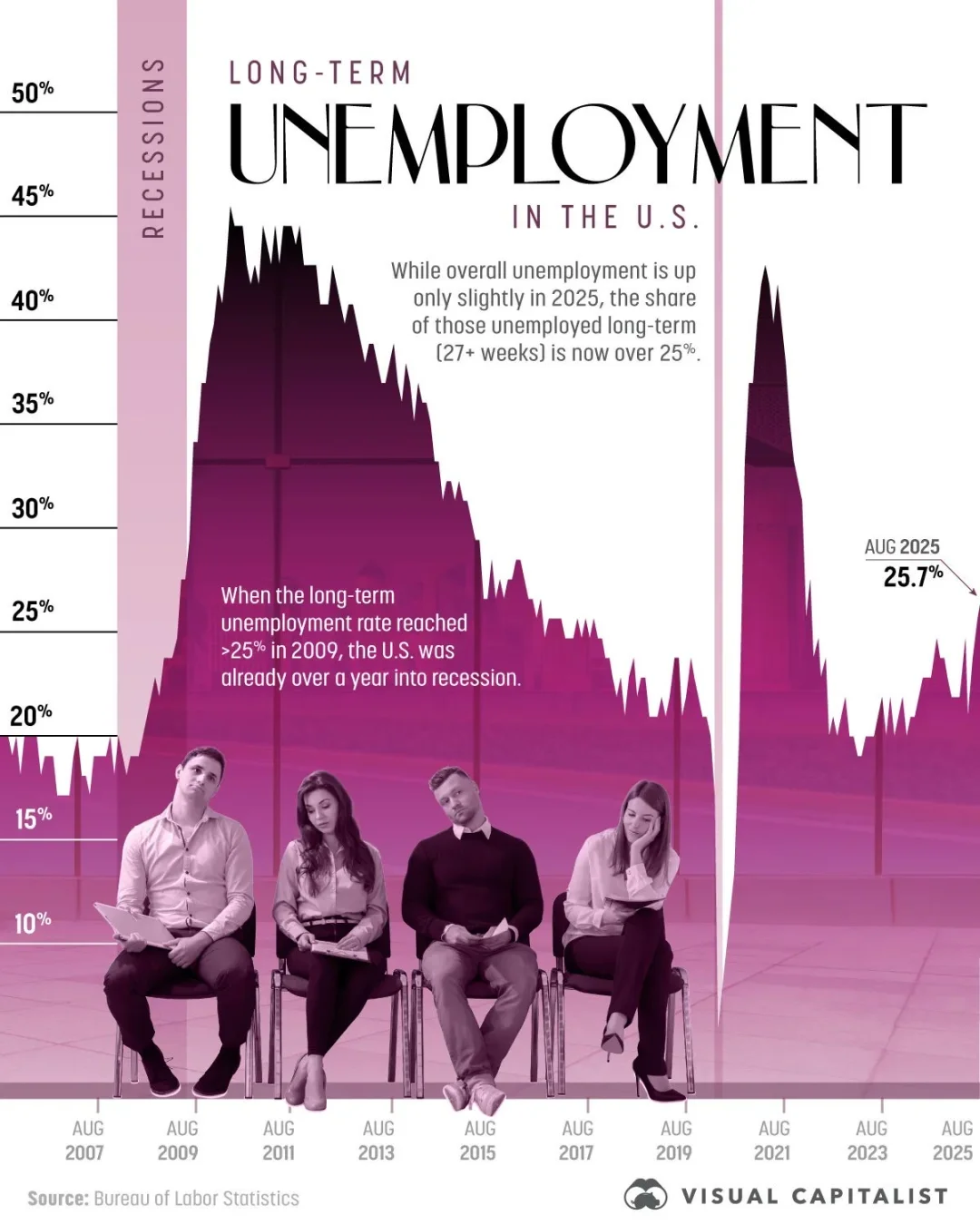 上一次长期失业率突破25%是在2009年金融危机期间,当时美国已深陷经济衰退超过一年。如今,这一水平再次出现,让人不禁联想到历史的回声。尽管美国经济总体数据仍显“韧性”,但长期失业率的飙升往往预示着经济放缓、消费信心下降和劳动力市场结构性失衡。