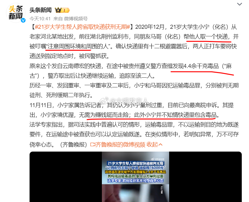 头条小编也学坏了,配套的视频画面中,最上方明显写着,“取个快递、给我16000元”,小编在文字中就是一个字也不提这个巨额的、违反常理的跑腿费,这个21岁大学生,内心能不知道这里面是什么东西吗?新闻学从业人员被网民看不上,是有原因的
