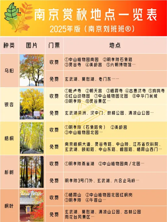 🍂南京梧桐黄了吗? 🍁南京枫叶红了吗? 📆11月XX能看什么呀? 👀最近经常收到大家这类的问题,也感受到了大家来南京赏秋的热情~ 📖今天班班给大家更新播报南京赏秋进度,11月下旬将迎来南京秋色的顶峰,多种植被可以同时看到,绝对不会让你失望哒~ 📆2025年南京赏秋时间速记: 🍁红枫热情似火:推荐12月初 🔥秋色五彩斑斓:推荐11月中下旬 👣秋色登场顺序:乌桕(逐步下线)→银杏(即将开启)→梧桐→落羽杉→红枫 🍂秋色观赏时间推荐:2025.11.13进度说明 ①乌桕:10.26~11.15(基本下线) ②银杏:11.16~11.30(开始变黄) ③梧桐:11.21~12.10(目前绿色) ④落羽杉:11.16~12.5(绿色为主,开始渐变) ⑤枫叶:11.26~12.10(少量红色,还需等待) 🗺️南京赏秋四大闭眼去地点: ①中山植物园:50元(联票) ②明孝陵:70元(早安特惠35元) ③玄武湖:免费参观 ④莫愁湖:免费参观 以上景区植被丰富,每一种秋色基本都可以看到,所以秋天无论什么时间段去,都可以看当下应景的秋色~其他赏秋地点可以参考图② 👣南京赏秋经典两日游路线: 🍁梧桐大道→🍁明孝陵→🍁中山植物园(南北园)→(🍜老门东→🏮夫子庙) 🔥南京博物院→总统府→鸡鸣寺→🍁南京城墙→玄武湖→(🍜新街口) 👀如果是红枫上线期间,还可以再给🍁栖霞山单独安排一天的时间 📣此外,近期来南京还有重要提醒 ①侵华日军南京大屠杀遇难同胞纪念馆闭馆至12月13日,这期间无法参观 ②南京红山动物园12月将安排免费开放日,预计一周时间,想免费或者想避开人流高峰,都要提前做好安排~ 🔥更多赏秋指南,将持续更新~