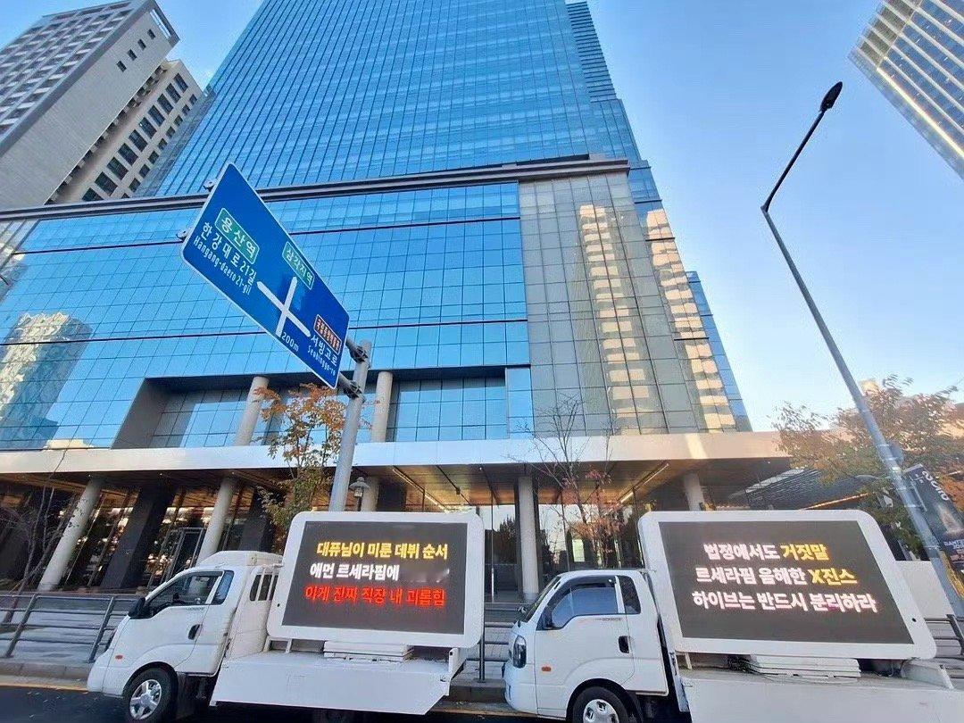 LESSERAFIM今日关于newjeans的维权卡车内容:加害者粉丝团“버X즈”对LE SSERAFIM的恶意评论攻击至今仍在持续进行中!HYBE必须积极采取法律诉讼。那些即使在法庭上也撒谎、污蔑LESSERAFIM 的"X진스",必须从 HYBE中分离出去。禁止强行道歉秀和强行和解秀!根本没人想要!是把“대퓨님”被推迟的出道的顺序,迁怒于无辜的LE SSERAFIM吗?这是真正的职场欺凌!必须将真正的加害者“红豆女”和真正的受害者LE SSERAFIM彻底分开