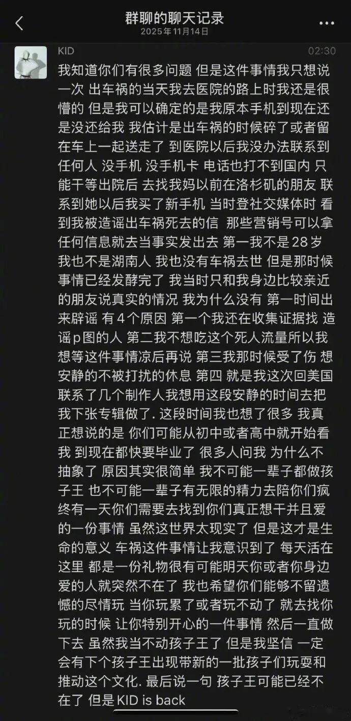 娱乐圈真是充满戏剧性,说唱歌手“孩子王”Jake一个月前被传在美国车祸去世,他母亲还发朋友圈讣告确认。可就在11月14日,他在粉丝群发长文官宣回归了。 这位1997年出生的歌手,以“抽象风格”和冲上Kanye海口演唱会舞台被大众熟知,作品是“无厘头歌词+夸张表演”,是“说唱圈的荒诞派”,但风格小众半出圈。他说车祸后手机没了没法联系别人,看到死讯发酵完了没辟谣,而是收集证据和做专辑。这操作挺让人意外,也期待他沉淀后带来新作品。