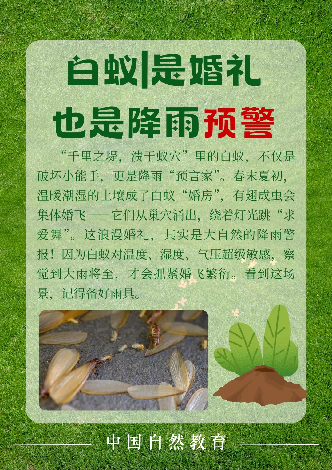 大自然藏着神秘气象员!蚂蚁搬家堵洞口,预示大雨要来临;蜻蜓低飞贴水面,湿气重需防阵雨;蜜蜂归巢早,明日晴天到;蟋蟀鸣声响,晴天稳当当。这些小小的昆虫,凭本能感知气象变化,跟着它们的踪迹,就能解锁自然天气预报~