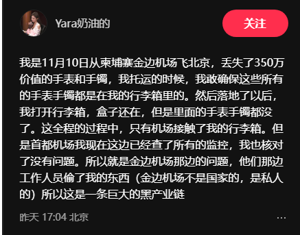 她在首都机场这边报警并查了所有的监控,怀疑是柬埔寨金边德崇机场那边出了问题。