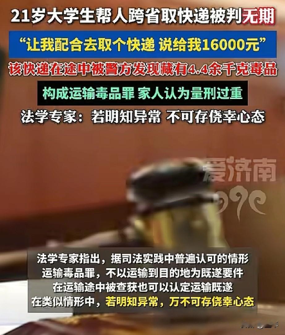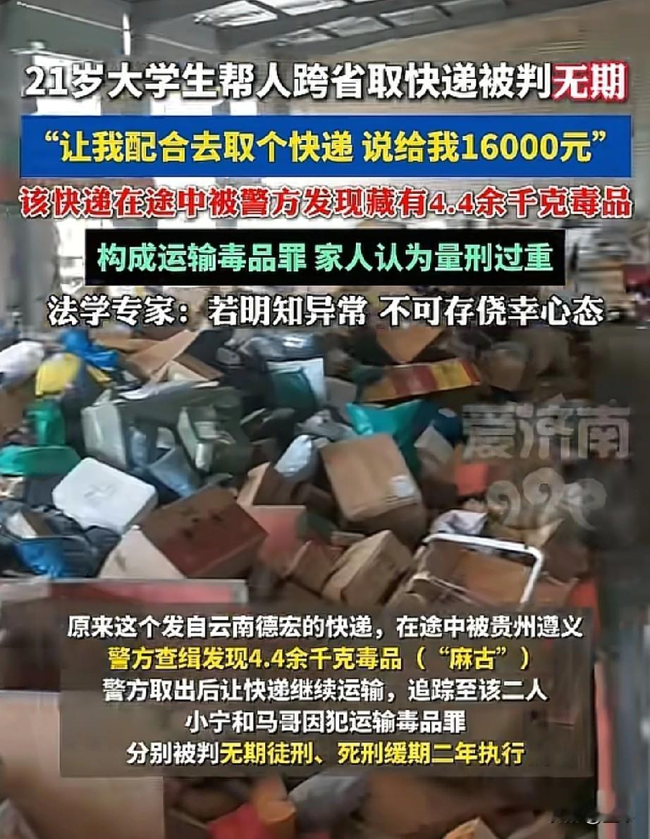 别拿“侥幸”赌人生,21岁大学生被判无期徒刑,是给所有人的警钟。 你有没有过这样的念头? “就帮取个快递,16000块稳赚,能有啥事儿?” “转笔账而已,对方说没问题,警察哪能刚好查到我?” “卖张银行卡换点钱,我又没偷没抢,不算犯罪吧?” 21岁大学生的“无期判决书”,撕开了“侥幸”最残酷的一面, 他接下“跨省取包裹”的活儿,或许真没打开看过里面的4.4千克毒品,或许真觉得“只是跑个腿”——可法律不管“你以为”,只认“你做了什么”:反常的高报酬、刻意的保密要求、不合常理的流程,这些“不对劲”,本就是风险的警报。 很多人犯罪,不是不懂“这事儿不对”,而是赌“我能躲过”。 但毒品、洗钱、帮信这些罪,从没有“幸运儿”:帮人转一笔不明账款,可能是洗钱罪;卖一张自己的银行卡,可能是帮信罪;接一个“轻松赚快钱”的跑腿活,可能是涉毒重罪。 “侥幸”从来不是“小聪明”,是拿人生下的烂赌。你赌“一次没事”,法律赌的是“社会安全”;你算的是“收益多少”,代价却是“刑期几年”“前途尽毁”。 别等判决书拍在面前,才懂那些“天上掉的馅饼”,早标好了比命还贵的价码;那些“应该不会查到我”的侥幸,最终都会变成“法律不会放过你”的实刑。 (别让“侥幸”,把自己活成下一个警示案例) 大学生 犯罪