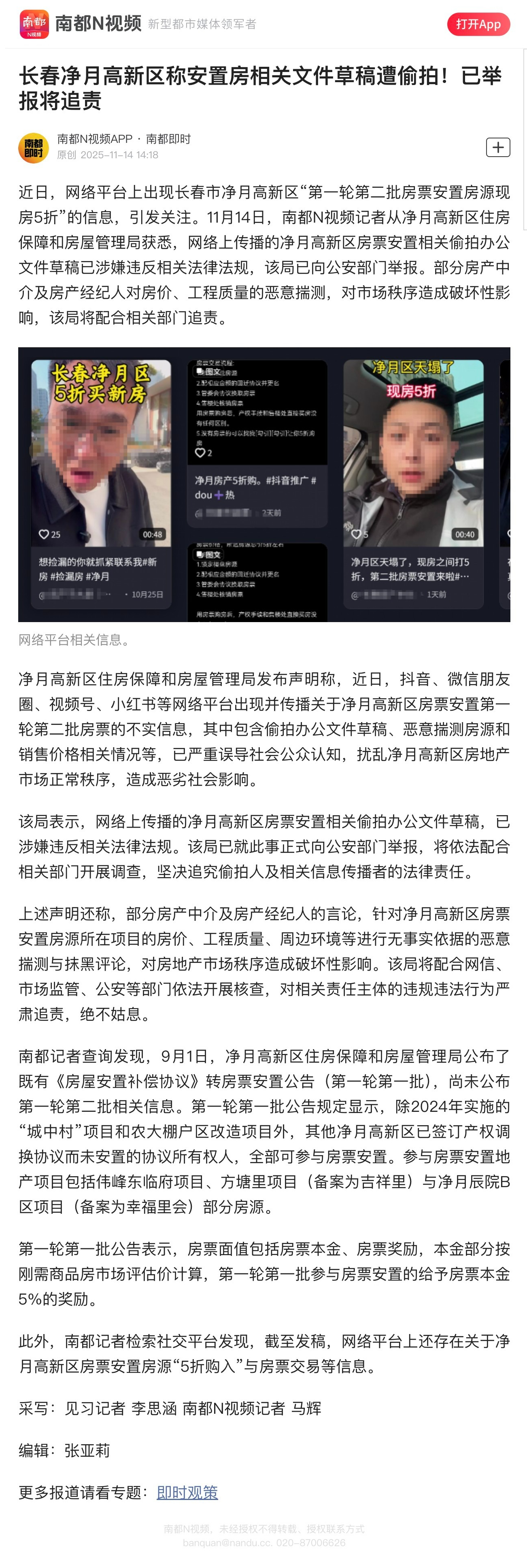 【长春净月高新区称安置房相关文件草稿遭偷拍!已举报将追责】近日,网络平台上出现长春市净月高新区“第一轮第二批房票安置房源现房5折”的信息,引发关注。11月14日,南都N视频记者从净月高新区住房保障和房屋管理局获悉,网络上传播的净月高新区房票安置相关偷拍办公文件草稿已涉嫌违反相关法律法规,该局已向公安部门举报。部分房产中介及房产经纪人对房价、工程质量的恶意揣测,对市场秩序造成破坏性影响,该局将配合相关部门追责。南都N视频记者 马辉 见习记者 李思涵
