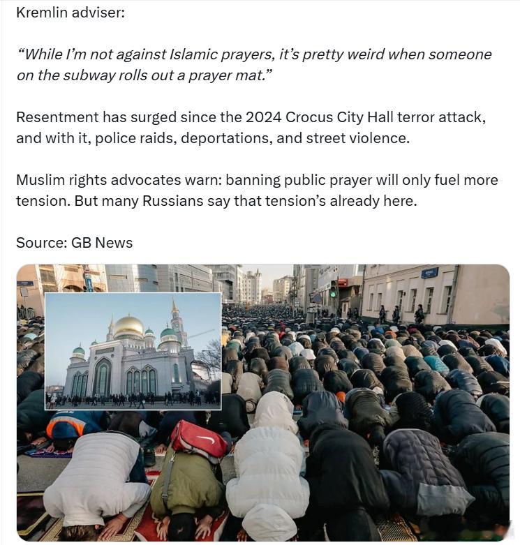 俄罗斯多座城市出现穆斯林移民在人行道、公交站、建筑旁甚至垃圾桶边公开祈祷的视频,引发当地居民强烈不满。俄罗斯有数百万来自中亚的移民,却只有约七八千座清真寺,许多人说他们只能在户外祈祷,但当地民众认为这种行为“扰民”“挑衅”。