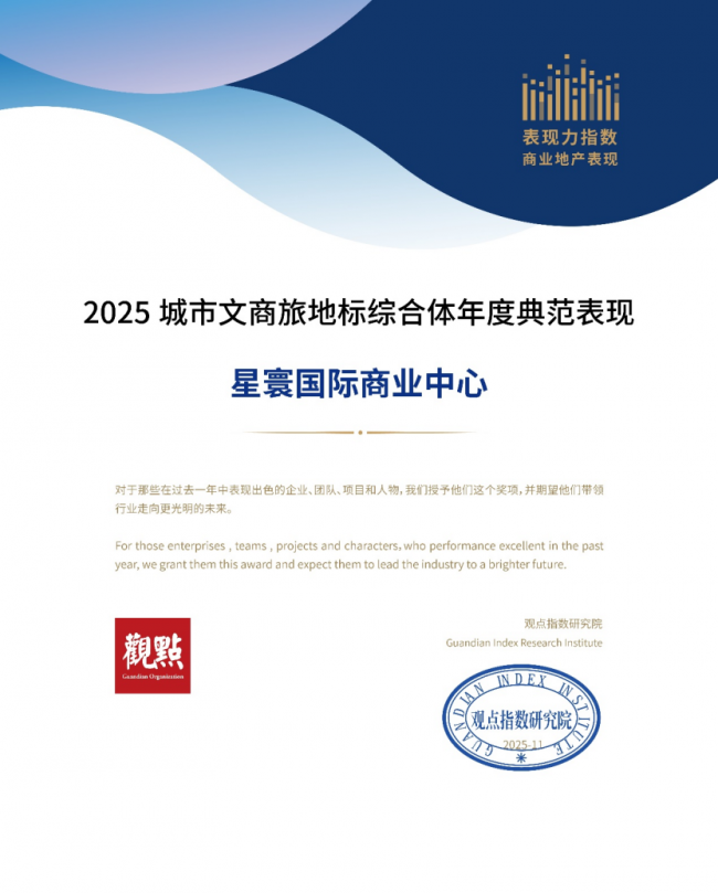 星寰国际商业中心获颁发“表现力指数•2025城市文商旅地标综合体年度典范表现”奖项