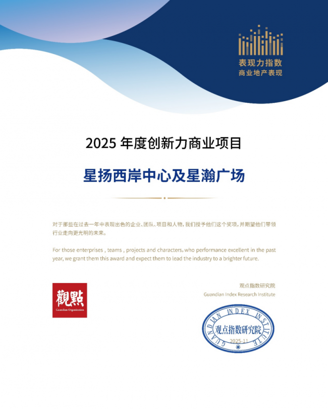 星扬西岸中心及星瀚广场获颁发“表现力指数•2025年度创新力商业项目”奖项