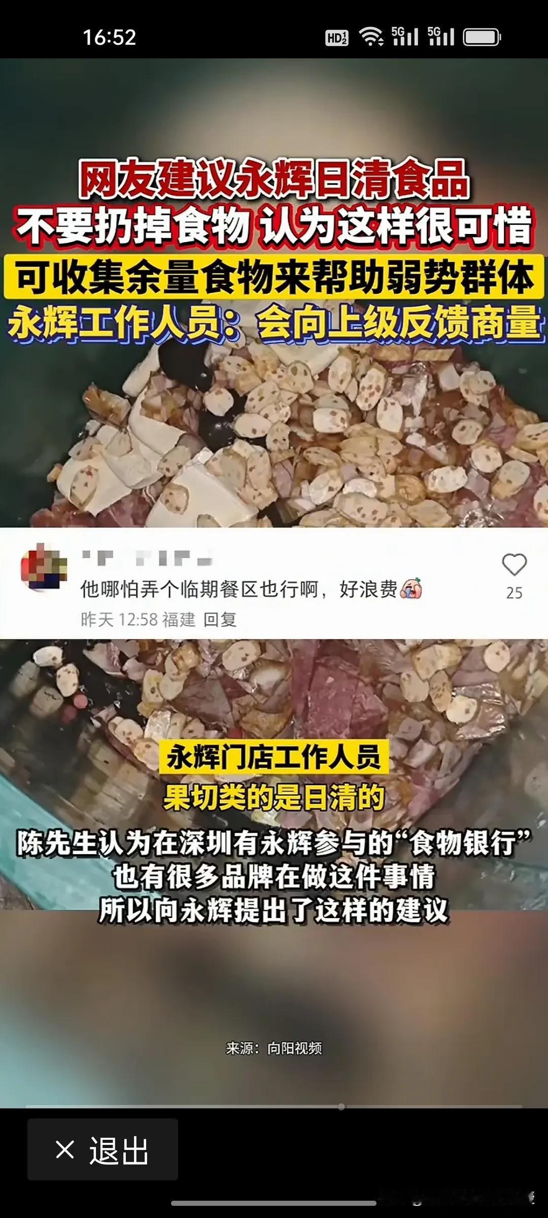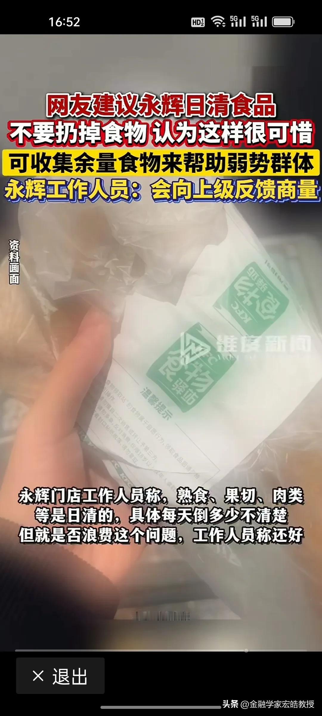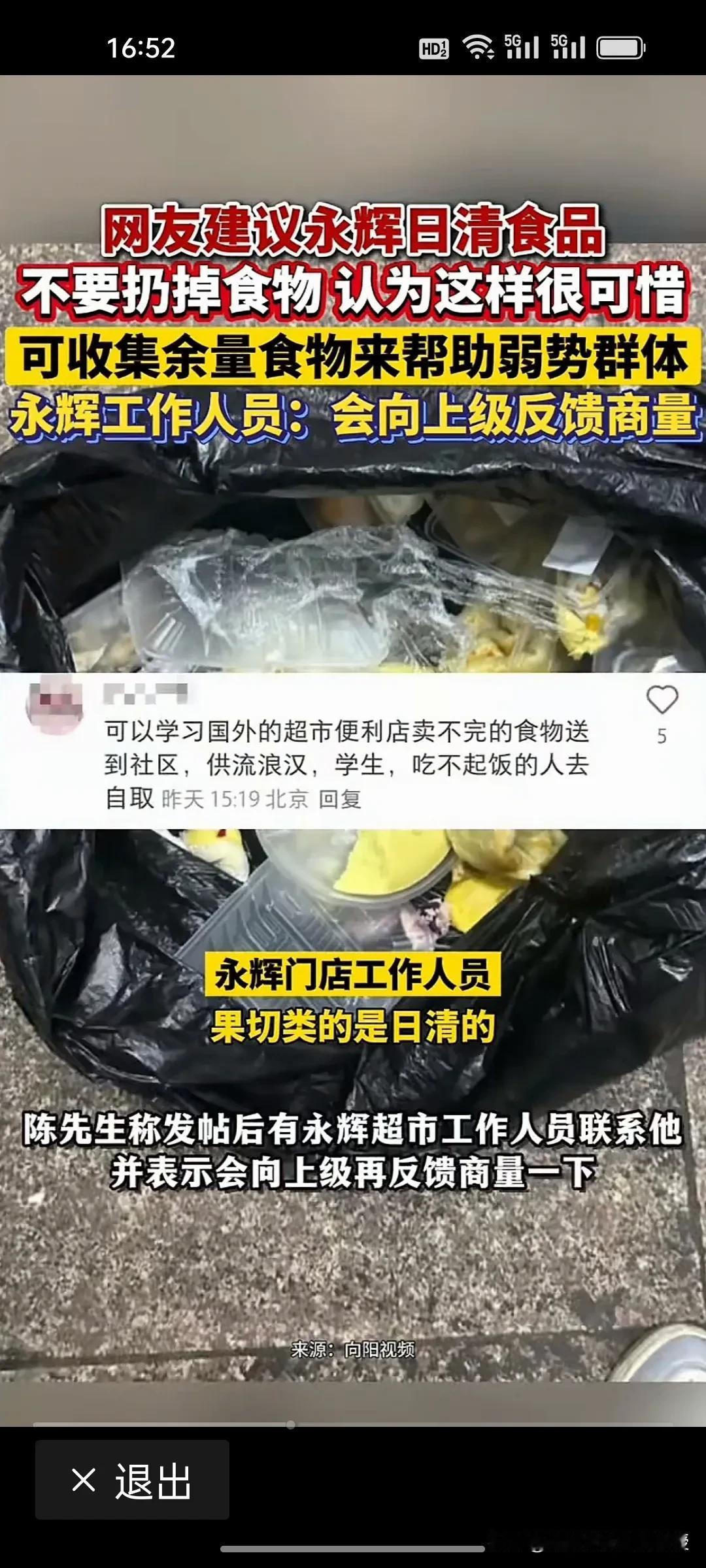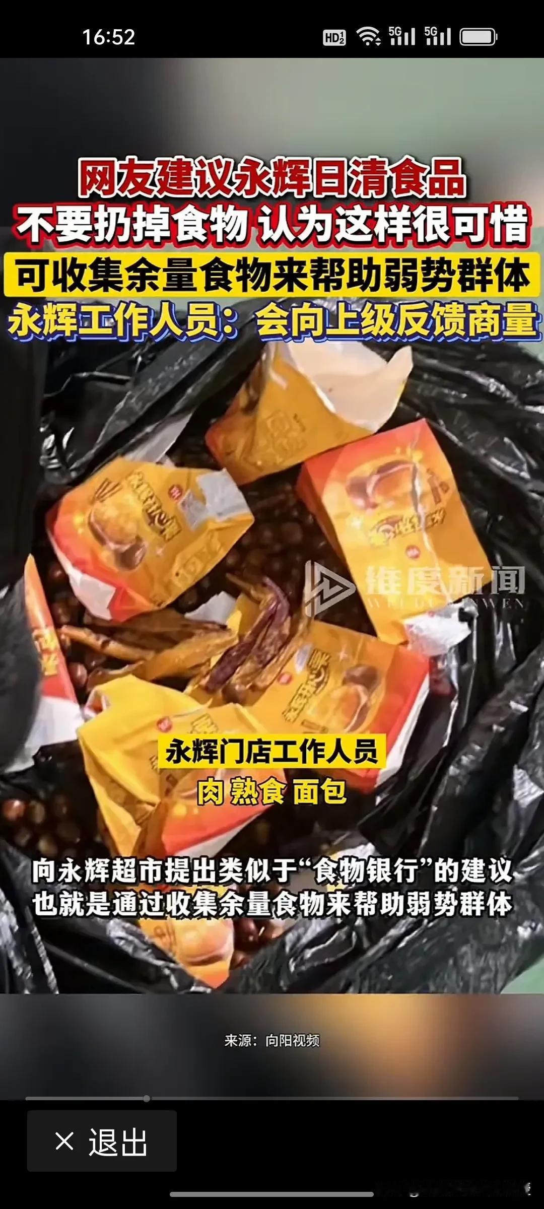 原来超市里每天也会扔掉大量当天卖不掉的食品,网友直呼太浪费了! 前几天看到上海有多家面包店把当天卖不掉的面包全部扔在垃圾袋里还喷消毒水,很多网友直呼这些店太浪费,今天看到有网友发文说永辉超市的日清食品(每天必须卖掉或处理掉的肉,熟食,面包,果切等食品)每天都大量扔掉太可惜,网友向永辉门店工作人员提出“食物银行”的建议,可以把这些余量食物收集起来送给弱势群体,国外有的超市便利店就把卖不掉的食品送到社区,给学生,流浪汉,吃不起饭的人发放。 永辉超市的工作人员接受了建议,并称会向上级反映商量。 其实,超市,面包房都可以估算一天的客流量来提供日清的食物,只限量做受欢迎的,这样才能从根本上减少浪费。
