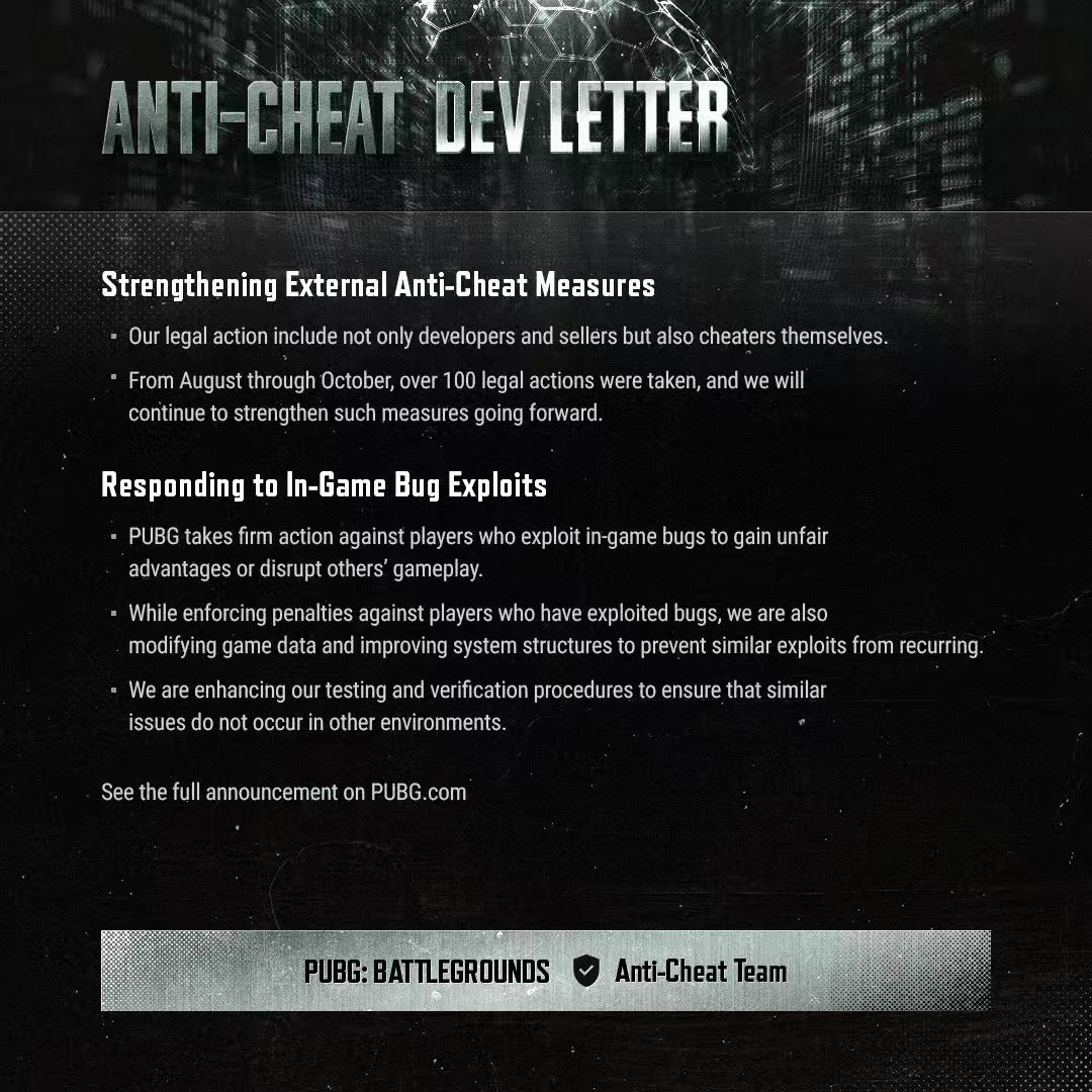 ·PUBG对利用游戏内漏洞获取不公平优势或破坏他人游戏体验的玩家采取坚决行动。