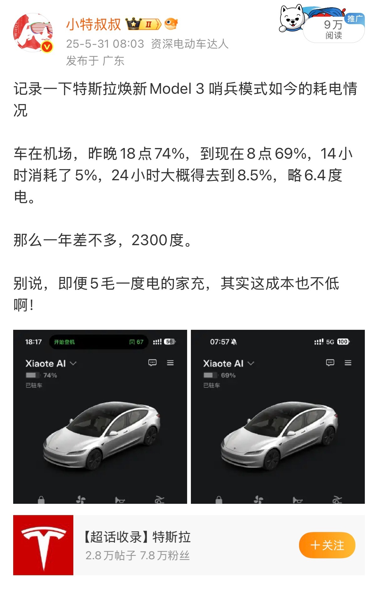 冰箱开 + 守卫模式开,23小时13分,三代 ES8 掉电 10KM,大概2度电左右这个静默耗电水平真的可以,实打实的省钱。各家都应该重视起来这个东西。之前Model 3 我测试下来,没有冰箱,纯哨兵24小时5-6度电。下次出差我再测试下,把冰箱关了,纯守卫模式下,看看ES8 耗电情况如何。