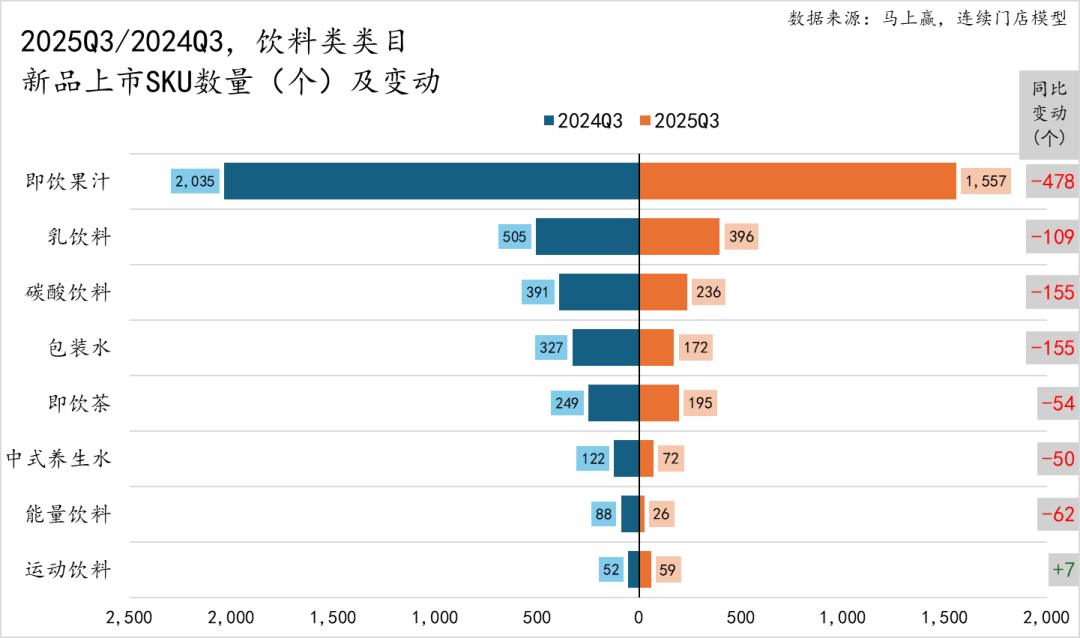 而来自线下零售检测机构马上赢的数据显示,今年第三季度,除了运动饮料的新品SKU数量较去年增加了7个至59个之外,即饮果汁、乳饮料、碳酸饮料、包装水、即饮茶、中式养生水、能量饮料等七大类的新品SKU数量合计同比减少近1100个。其中果汁品类同比减少了478个,乳饮料减少了109个,碳酸饮料、包装水都减少了155个……