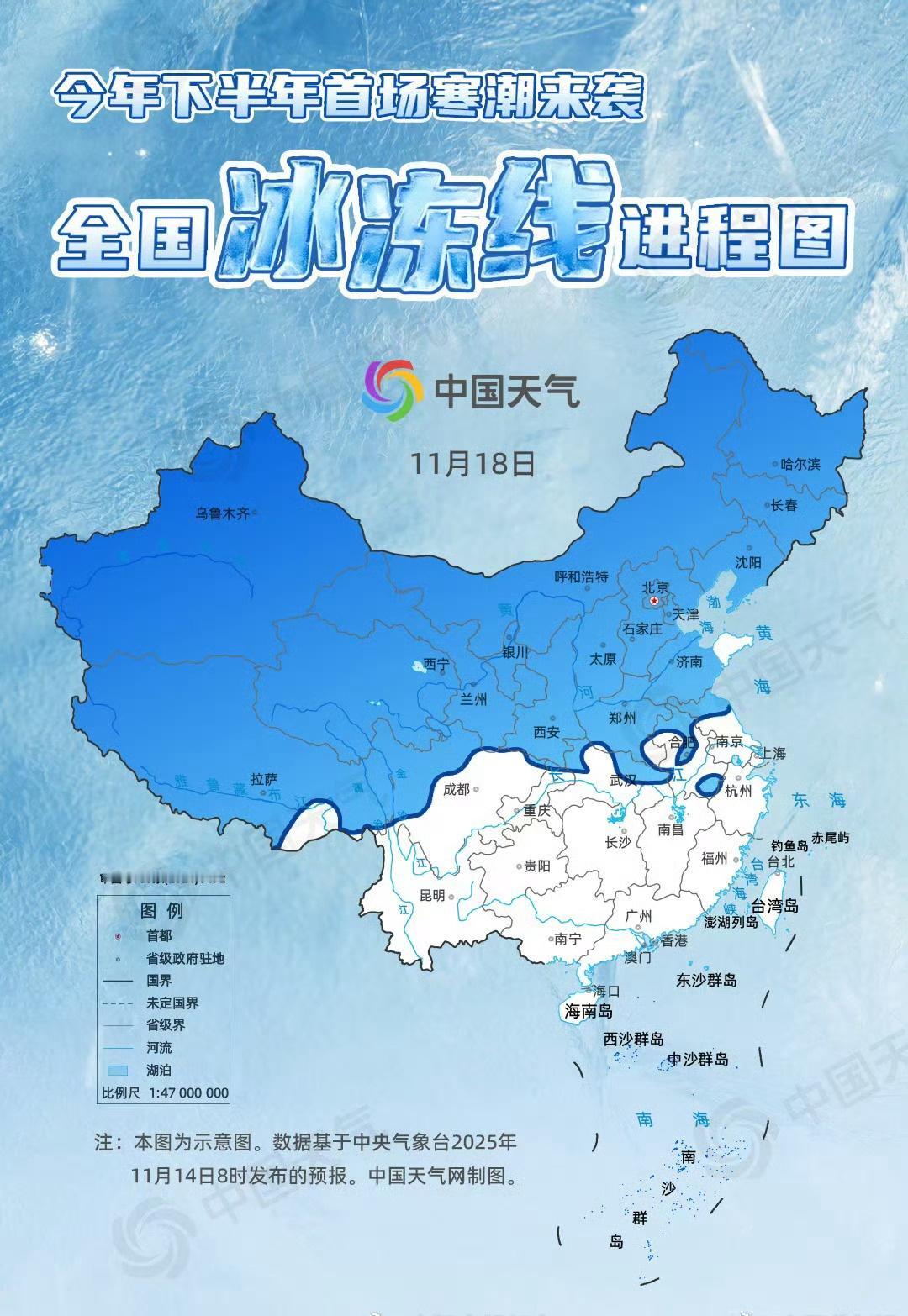 【下周的主线任务是防寒】随着今年下半年首场寒潮发威,11月14日至17日,大部地区气温将由偏高转为偏低,部分地区降温可达12至14℃。本次寒潮过程具有影响范围广、降温幅度大、大风天气强等特点,冰冻线将一路推进至江汉、江淮一带。 从中国天气网推出的全国冰冻线进程图来看,14日至15日,降温区域主要集中在新疆北部、内蒙古中西部一带,其他地区降温不明显,15日和16日早晨,冰冻线仍维持在西北地区东部至东北地区南部一线。 16日,甘肃东部、宁夏、陕西、山西、河北、北京、天津、内蒙古、辽宁、吉林等地降温明显,17日早晨冰冻线南移至黄淮北部。 17日至18日,南方大部迎来降温,18日早晨冰冻线将南压至苏皖南部、湖北北部一带。 在寒潮影响下,我国大部气温将创今年下半年来的新低。大城市中,西安、济南、合肥、武汉最低气温都将是下半年来首次跌破0℃,呼和浩特和哈尔滨将跌破零下10℃,天气寒冷,大家请及时添衣保暖。