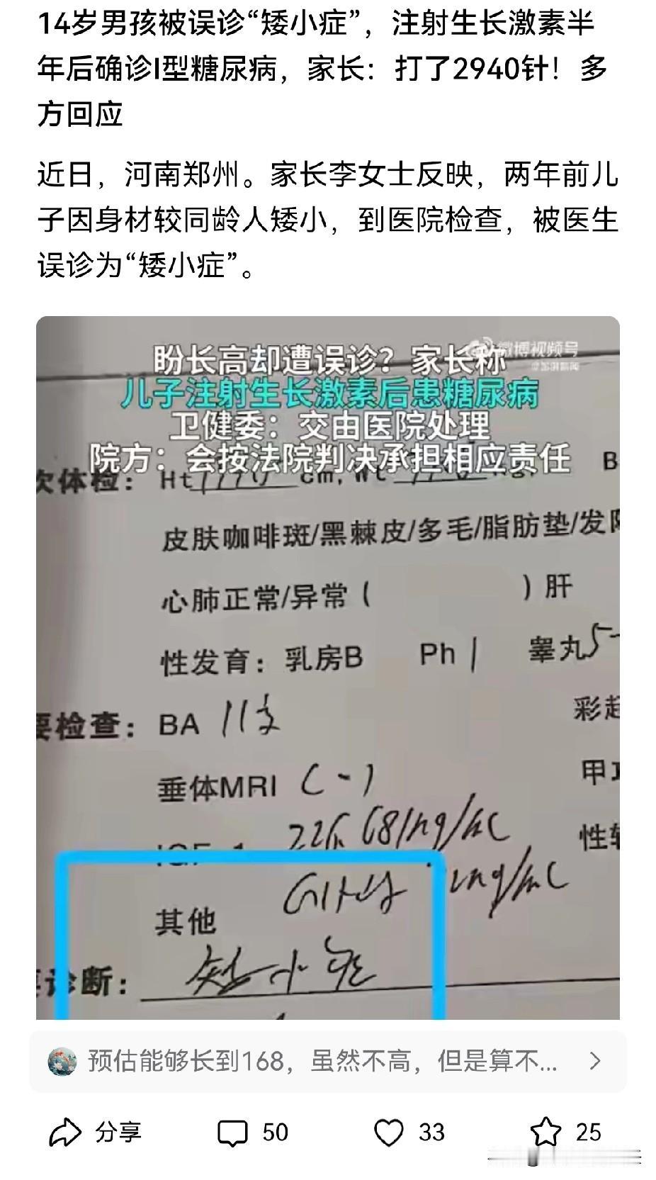 医生黑心、家长无知,坑害了一个健康的孩子,真是让人痛心! 郑州一位家长,因为14岁的孩子个子矮带去医院检查,被当值医生诊断为“矮小症”,对孩子采取了注射生长激素的治疗手段! 先抛开医生的问题不谈,就这家长选择相信医生也是无知透顶,正常治疗也罢了,普通人去医院没办法只能相信医生,可是注射生长激素你是怎么想的?揠苗助长没学过?这是给孩子治病吗?这是无知害自己孩子呢! 在多次注射激素后,孩子患上了糖尿病,每天需要注射胰岛素,孩子多遭罪啊?唉!真是没法说了! 小孩个子矮点就矮点,只要健康成长就行了,干嘛非得180以上的大个子啊,无语至极! 对于这个误诊的无良医生,一定要让他付出代价!