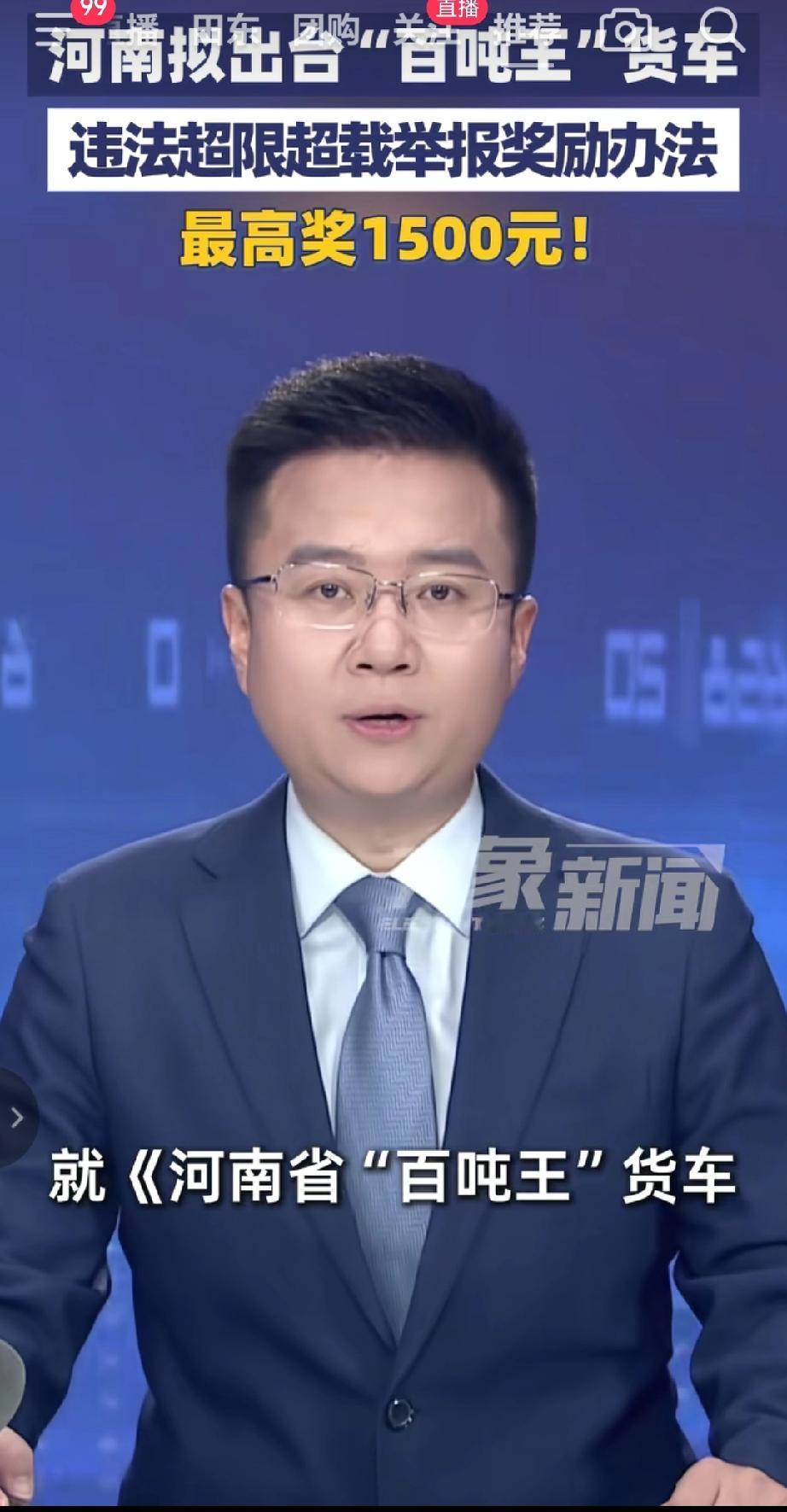 为了更加严格治理货车超载11月13日,河南省交通运输厅就《河南省“百吨王”货车违法超限超载举报奖励暂行办法(试行)》公开征求意见,但凡有 举报“百吨王”货车(车货总质量超过100吨的货运车辆)违法超限超载行为,一经查证属实的,奖励1000元, 举报货运源头单位违法装载放行“百吨王”货车出厂出站的,经查证属实的,奖励1500元。(来源于@大象新闻)