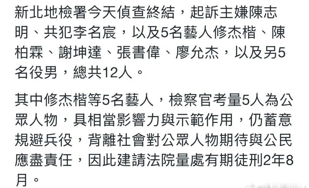 肠子都悔青了,陈柏霖、修杰楷等人因为躲兵役的事情被起诉了,后面可能会被判刑两年以上再加上这些人都是公众人物,影响十分恶劣,后续会不会增加刑期还不一定而这一切的起点,可能仅仅是王大陆不会开特斯拉车门,然后跟人家司机起了冲突最后牵扯出这么多事情感觉这个事情里输出都特别荒诞和诡异,如果拍成电影,应该能拿奖吧