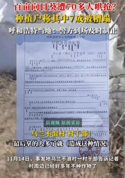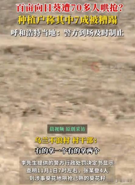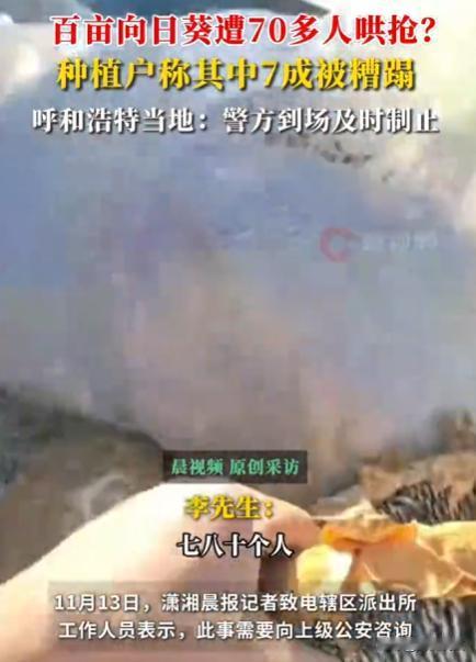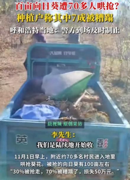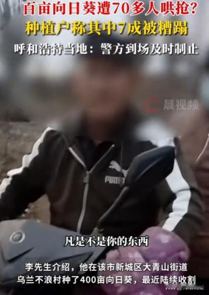 内蒙古呼和浩特,有位男子承包400亩地种向日葵,辛苦一年到收割季,却遭附近村民哄抢糟蹋,100亩向日葵颗粒无收,损失高达50万。男子气不过报警,村民称以为向日葵不要了才来摘。本以为法不责众能躲过,没想到民警的处理让村民傻了眼。 据悉,李先生原本在城里做点小生意,前几年回村,看村里那400亩荒地荒着可惜,今年上级又委托他打理,他决定种向日葵。 眼瞅着秋天到了,向日葵长势很好,金黄的花盘沉甸甸的,就等着收割卖个好价钱。 可谁能想到,11月1号早上,他正睡懒觉,工人一个电话打过来,声音都变了调,说村里70多个村民在地里疯抢向日葵。 李先生一听,衣服都没顾上穿整齐,撒腿就往地里跑。 到那一看,现场乱成一锅粥,有人徒手在那掰花盘,有人拿着镰刀咔咔割,还有人开着三轮车、拖拉机,一趟一趟往车上装,那架势,跟不要钱似的。 李先生急得扯着嗓子喊,都别抢了,这是我的地,这是我的向日葵,可村民们就跟没听见似的,依旧我行我素。 李先生没办法,只好报了警。 民警到现场后,先控制住了30个人,剩下40多个一看情况不对,撒腿就跑,钻进村子里不见了踪影。 民警问那些被控制住的人,为啥来抢向日葵,村民们还振振有词,说听别人说这向日葵没人要了,他们才来摘的。 李先生气得直咬牙,这地是他承包的,种子是他买的,肥料是他施的,这一年他付出了这么多,这些村民倒好,一句没人要了就来抢,这不是明抢吗。 他跟民警说,自己这一年投入了大量的人力、物力、财力,这100亩向日葵颗粒无收,损失高达50万,这让他可咋活。 民警一边安慰李先生,一边展开调查。 经过一番走访询问,发现这哄抢事件背后,还真有人在那煽风点火,这个人就是男子张某。 张某听说李先生的向日葵快收割了,就四处跟人说,这向日葵没人要了,大家赶紧去摘。 这消息一传十,十传百,村里不少人就动了心思,觉得不摘白不摘,反正又不是自己一个人摘,法不责众。 于是,就出现了70多个村民集体哄抢向日葵的场面。 村民们认为向日葵没人要了才去摘,这是不是能成为他们免责的理由呢? 根据治安管理处罚法第四十九条规定,盗窃、诈骗、哄抢、抢夺、敲诈勒索或者故意损毁公私财物的,处五日以上十日以下拘留,可以并处五百元以下罚款;情节较重的,处十日以上十五日以下拘留,可以并处一千元以下罚款。 在这起事件中,村民们未经李先生允许,擅自进入他的承包地,哄抢他的向日葵,这明显属于哄抢公私财物的行为。 就算他们听信了张某的话,以为向日葵没人要了,但这也不能改变他们哄抢的事实。 因为李先生作为承包人,对这片向日葵拥有合法的所有权,村民们没有权利私自占有。 张某四处传播向日葵没人要了的虚假信息,煽动村民去哄抢,起到了教唆的作用。 根据相关法律规定,教唆、胁迫、诱骗他人违反治安管理的,按照其教唆、胁迫、诱骗的行为处罚。 所以,张某在这起事件中,也要承担相应的法律责任。 最终,经过调查取证,民警对张某等4人作出了行政拘留5日的处罚决定,其他参与哄抢的人员还在进一步调查中。