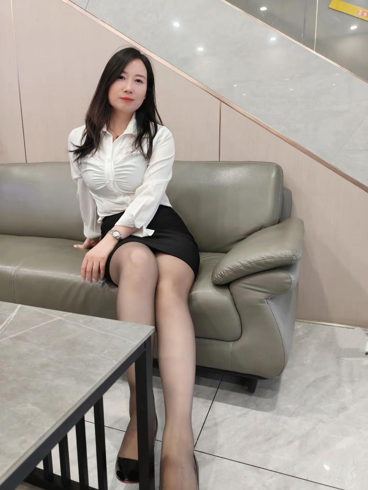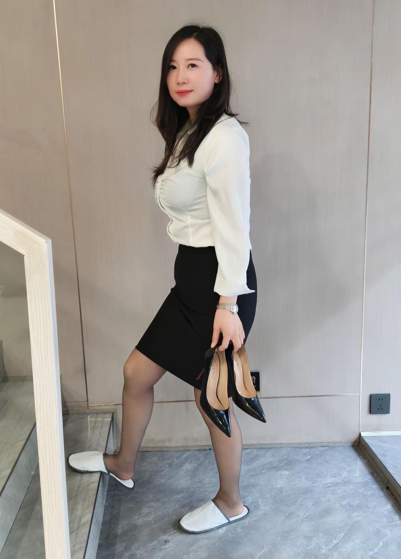 白衬衫+黑短裙简约利落,长发配精致发夹温柔又干练,脚踩透明高跟更显气质。