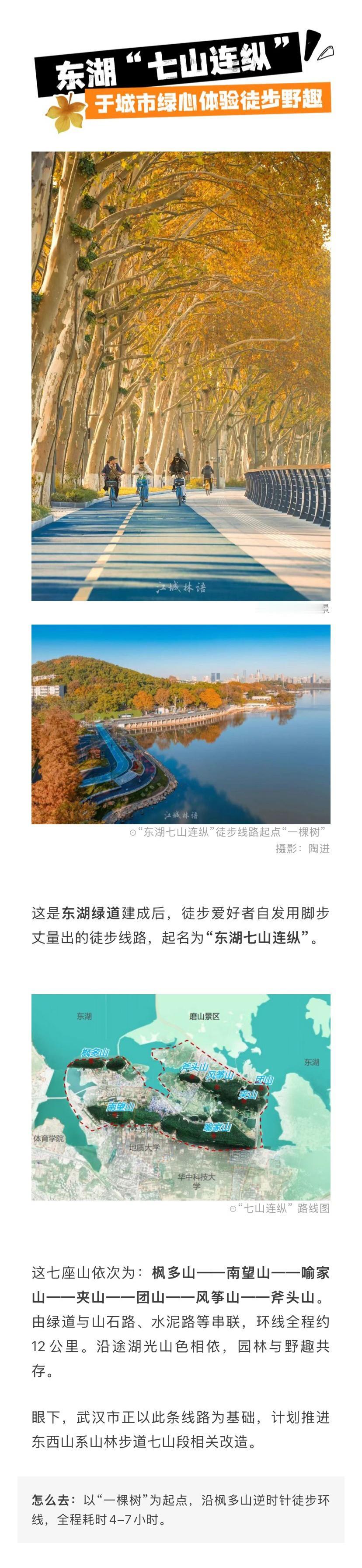 武汉登山徒步赏秋指南【发布!武汉秋日最美徒步线路来了】总长2426余公里的绿道,1024座星罗棋布的公园,串联、交织出许多具有治愈力的绿色空间。秋天的“千园之城”武汉总有一种让人停不下脚步的魔力,当秋风吹起落叶,当阳光洒进山林和湖畔,你会发现徒步不仅是一种运动,更是一种感受秋天的方式。无论是想拍下秋日大片,还是在忙碌生活中放空自己,不妨选一条合适的徒步路线,且行且赏醉美秋色。武汉城市漫游攻略 在武汉过秋天